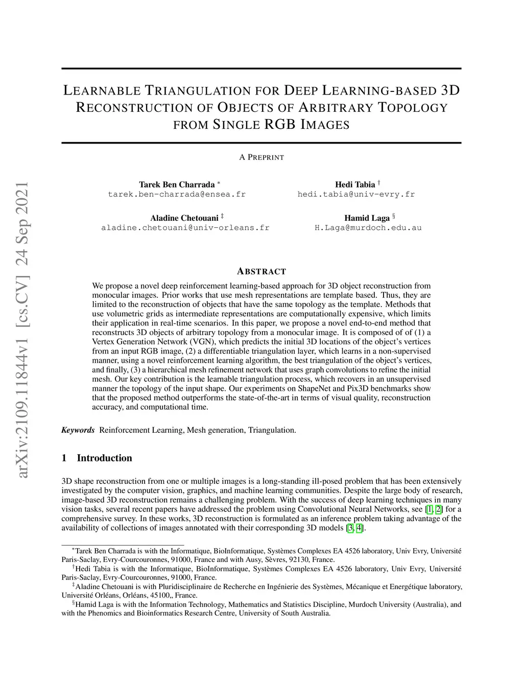 We propose a novel deep reinforcement learning-based approach for 3D object reconstruction from monocular images. Prior works that use mesh representations are template based. Thus, they are limited to the reconstruction of objects that have the same topology as the template. Methods that use volumetric grids as intermediate representations are computationally expensive, which limits their application in real-time scenarios. In this paper, we propose a novel end-to-end method that reconstructs 3D objects of arbitrary topology from a monocular image. It is composed of of (1) a Vertex Generation Network (VGN), which predicts the initial 3D locations of the object's vertices from an input RGB image, (2) a differentiable triangulation layer, which learns in a non-supervised manner, using a novel reinforcement learning algorithm, the best triangulation of the object's vertices, and finally, (3) a hierarchical mesh refinement network that uses graph convolutions to refine the initial mesh. Our key contribution is the learnable triangulation process, which recovers in an unsupervised manner the topology of the input shape. Our experiments on ShapeNet and Pix3D benchmarks show that the proposed method outperforms the state-of-the-art in terms of visual quality, reconstruction accuracy, and computational time.