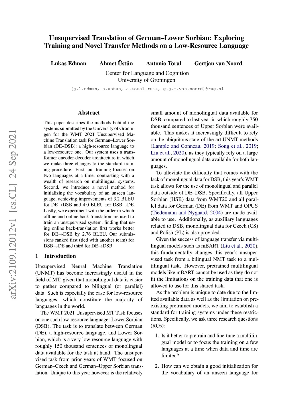 This paper describes the methods behind the systems submitted by the University of Groningen for the WMT 2021 Unsupervised Machine Translation task for German--Lower Sorbian (DE--DSB): a high-resource language to a low-resource one. Our system uses a transformer encoder-decoder architecture in which we make three changes to the standard training procedure. First, our training focuses on two languages at a time, contrasting with a wealth of research on multilingual systems. Second, we introduce a novel method for initializing the vocabulary of an unseen language, achieving improvements of 3.2 BLEU for DEDSB and 4.0 BLEU for DSBDE. Lastly, we experiment with the order in which offline and online back-translation are used to train an unsupervised system, finding that using online back-translation first works better for DEDSB by 2.76 BLEU. Our submissions ranked first (tied with another team) for DSBDE and third for DEDSB.