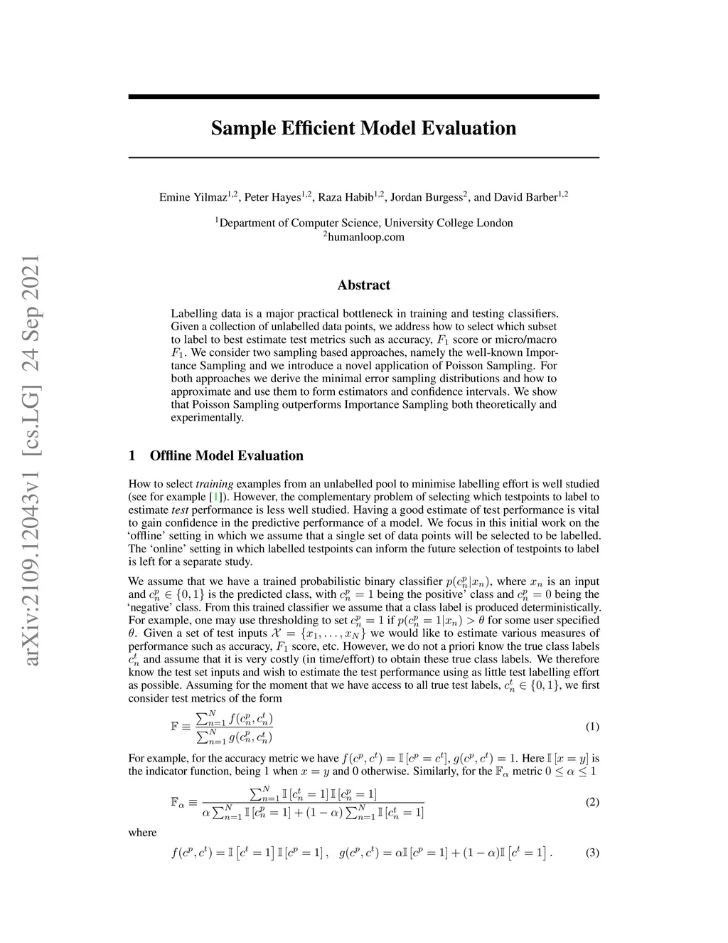 Labelling data is a major practical bottleneck in training and testing classifiers. Given a collection of unlabelled data points, we address how to select which subset to label to best estimate test metrics such as accuracy, score or micro/macro . We consider two sampling based approaches, namely the well-known Importance Sampling and we introduce a novel application of Poisson Sampling. For both approaches we derive the minimal error sampling distributions and how to approximate and use them to form estimators and confidence intervals. We show that Poisson Sampling outperforms Importance Sampling both theoretically and experimentally.
