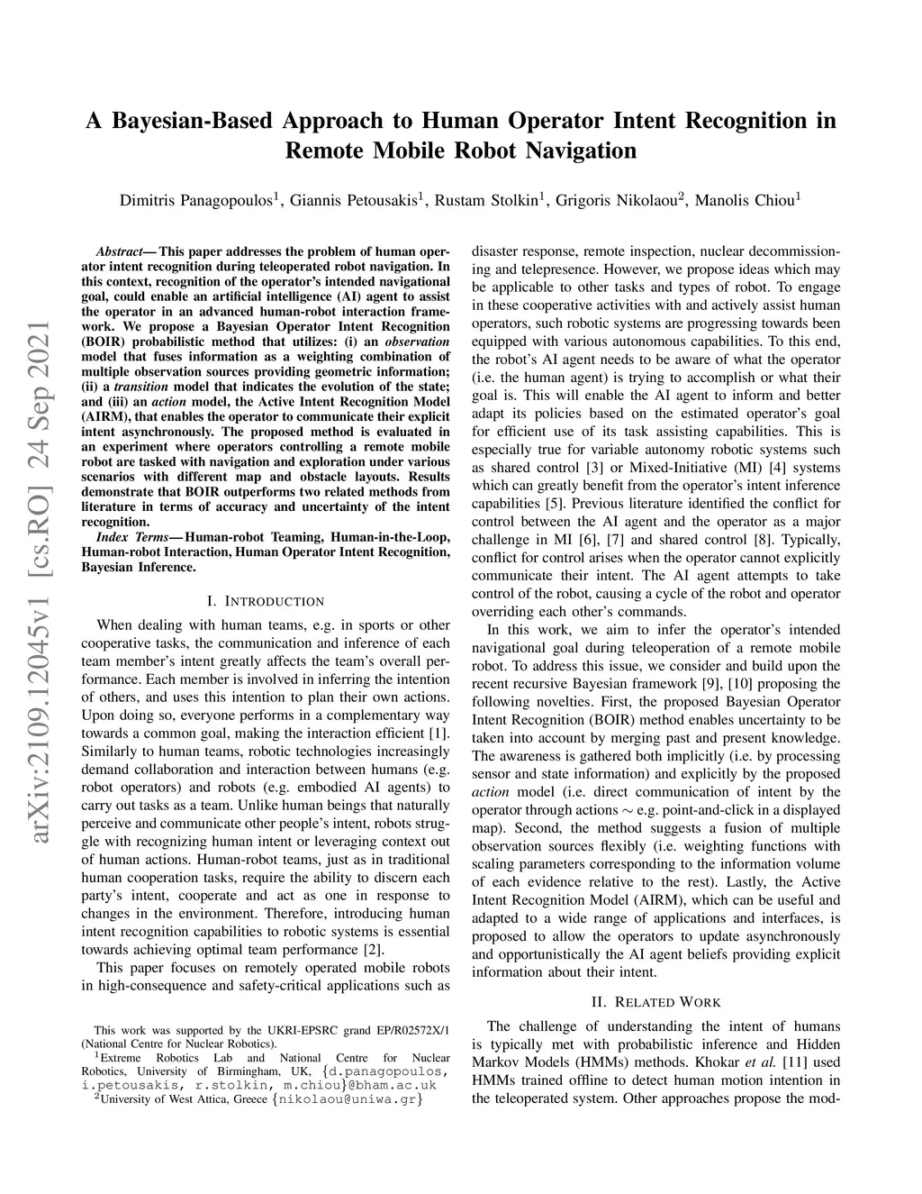 A Bayesian-Based Approach to Human Operator Intent Recognition in Remote