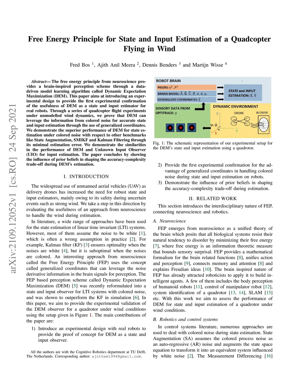 The free energy principle from neuroscience provides a brain-inspired perception scheme through a data-driven model learning algorithm called Dynamic Expectation Maximization (DEM). This paper aims at introducing an experimental design to provide the first experimental confirmation of the usefulness of DEM as a state and input estimator for real robots. Through a series of quadcopter flight experiments under unmodelled wind dynamics, we prove that DEM can leverage the information from colored noise for accurate state and input estimation through the use of generalized coordinates. We demonstrate the superior performance of DEM for state estimation under colored noise with respect to other benchmarks like State Augmentation, SMIKF and Kalman Filtering through its minimal estimation error. We demonstrate the similarities in the performance of DEM and Unknown Input Observer (UIO) for input estimation. The paper concludes by showing the influence of prior beliefs in shaping the accuracy-complexity trade-off during DEM's estimation.