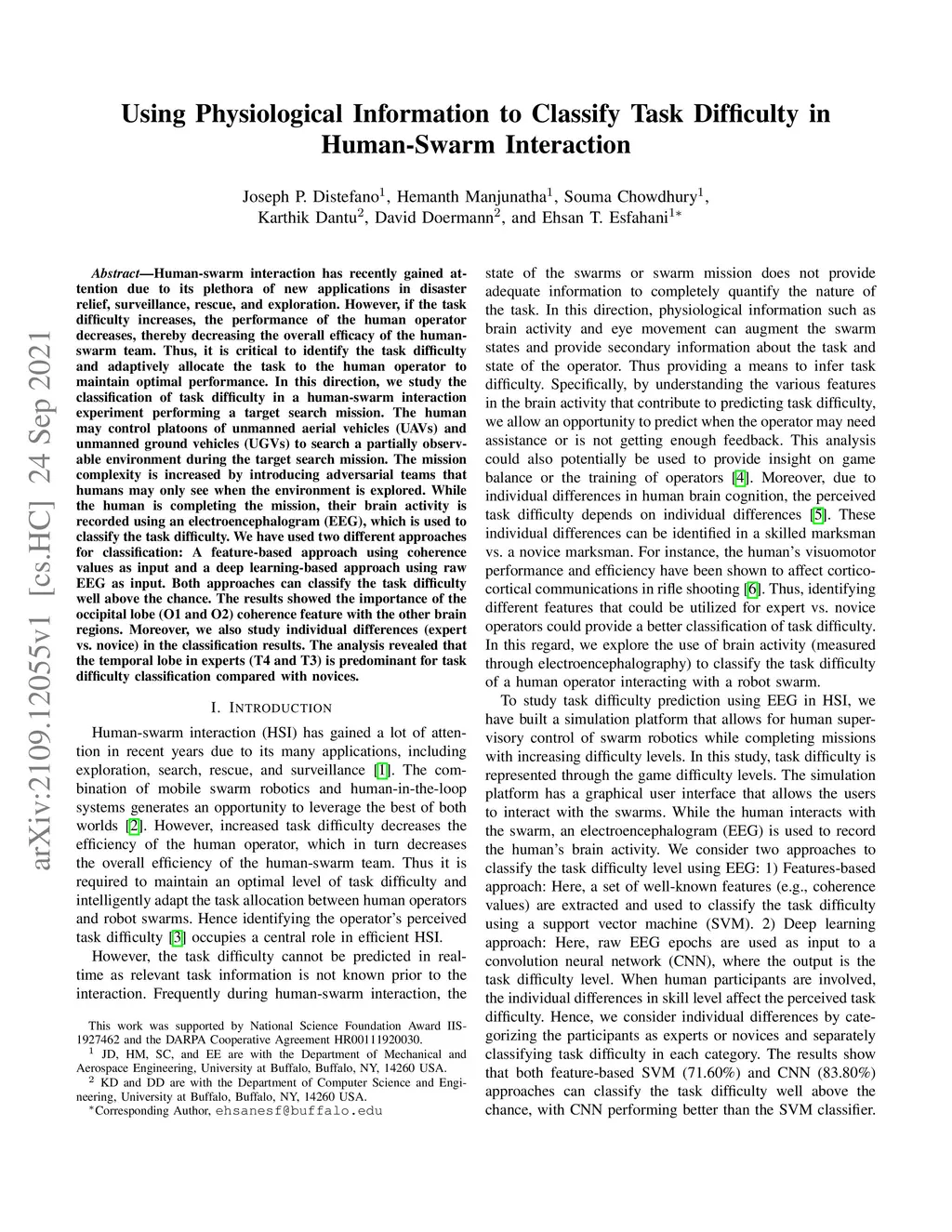 Human-swarm interaction has recently gained attention due to its plethora of new applications in disaster relief, surveillance, rescue, and exploration. However, if the task difficulty increases, the performance of the human operator decreases, thereby decreasing the overall efficacy of the human-swarm team. Thus, it is critical to identify the task difficulty and adaptively allocate the task to the human operator to maintain optimal performance. In this direction, we study the classification of task difficulty in a human-swarm interaction experiment performing a target search mission. The human may control platoons of unmanned aerial vehicles (UAVs) and unmanned ground vehicles (UGVs) to search a partially observable environment during the target search mission. The mission complexity is increased by introducing adversarial teams that humans may only see when the environment is explored. While the human is completing the mission, their brain activity is recorded using an electroencephalogram (EEG), which is used to classify the task difficulty. We have used two different approaches for classification: A feature-based approach using coherence values as input and a deep learning-based approach using raw EEG as input. Both approaches can classify the task difficulty well above the chance. The results showed the importance of the occipital lobe (O1 and O2) coherence feature with the other brain regions. Moreover, we also study individual differences (expert vs. novice) in the classification results. The analysis revealed that the temporal lobe in experts (T4 and T3) is predominant for task difficulty classification compared with novices.