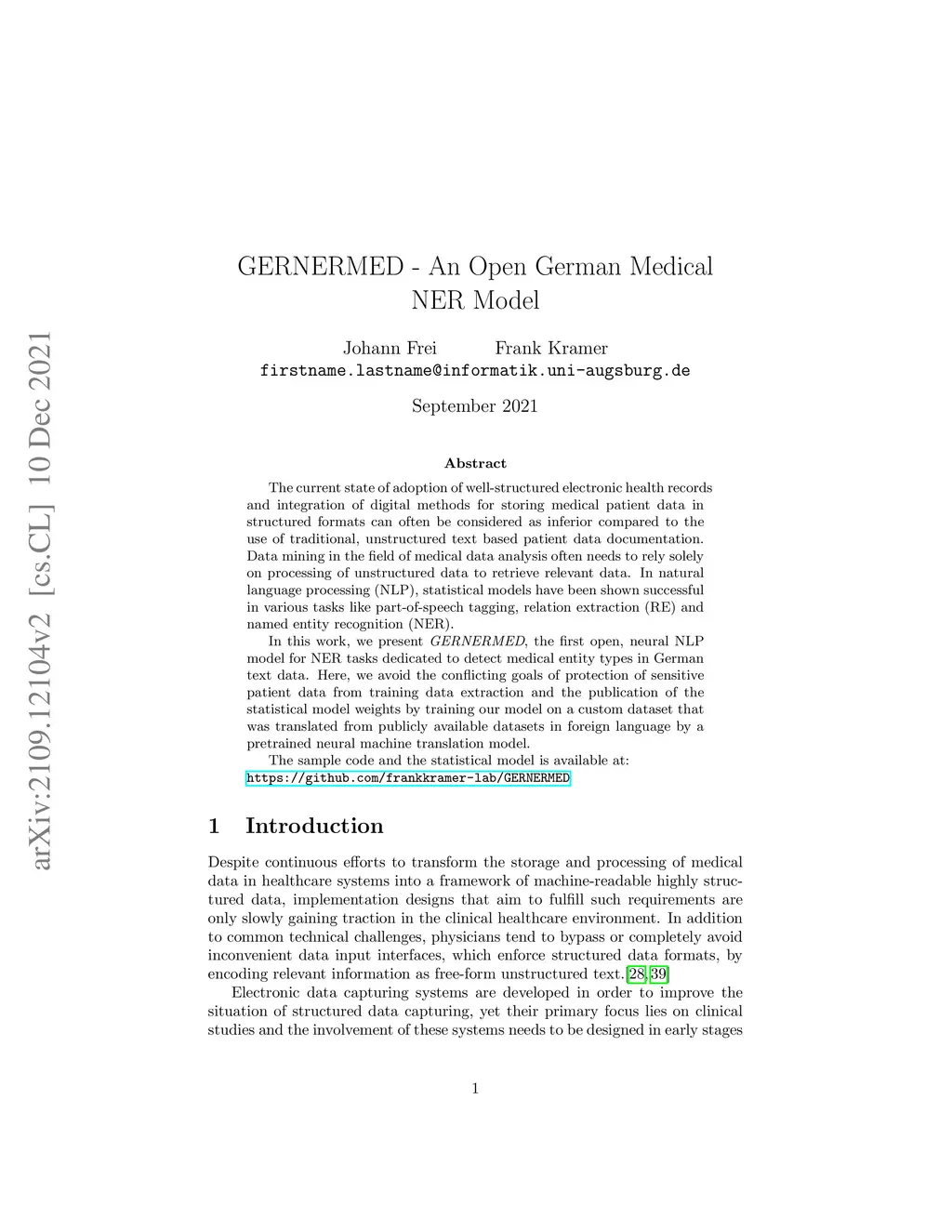 The current state of adoption of well-structured electronic health records and integration of digital methods for storing medical patient data in structured formats can often considered as inferior compared to the use of traditional, unstructured text based patient data documentation. Data mining in the field of medical data analysis often needs to rely solely on processing of unstructured data to retrieve relevant data. In natural language processing (NLP), statistical models have been shown successful in various tasks like part-of-speech tagging, relation extraction (RE) and named entity recognition (NER). In this work, we present GERNERMED, the first open, neural NLP model for NER tasks dedicated to detect medical entity types in German text data. Here, we avoid the conflicting goals of protection of sensitive patient data from training data extraction and the publication of the statistical model weights by training our model on a custom dataset that was translated from publicly available datasets in foreign language by a pretrained neural machine translation model. The sample code and the statistical model is available at: https://github.com/frankkramer-lab/GERNERMED