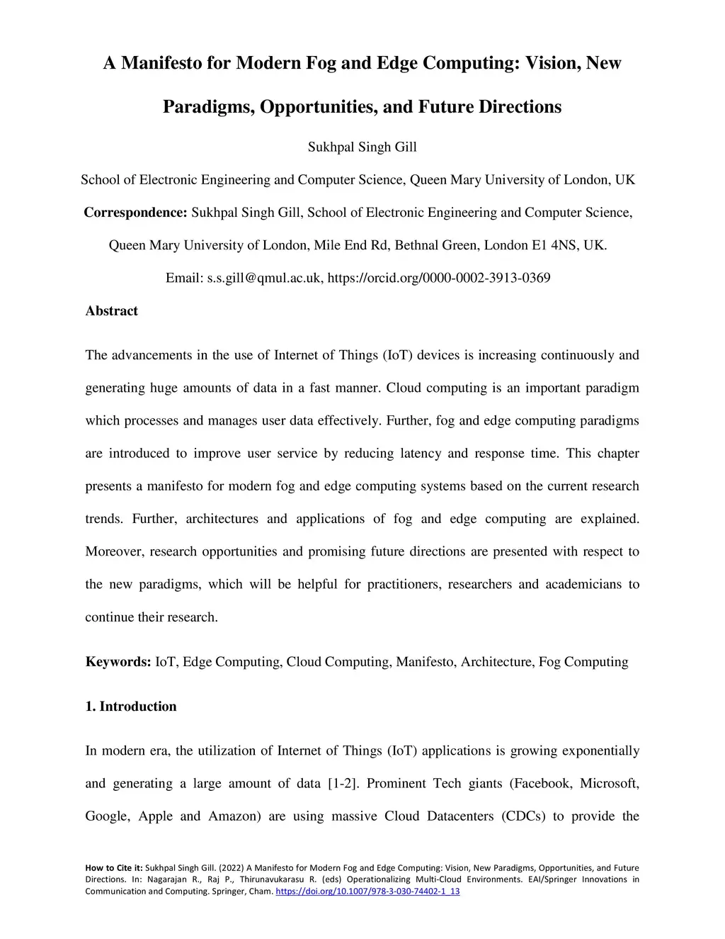 The advancements in the use of Internet of Things (IoT) devices is increasing continuously and generating huge amounts of data in a fast manner. Cloud computing is an important paradigm which processes and manages user data effectively. Further, fog and edge computing paradigms are introduced to improve user service by reducing latency and response time. This chapter presents a manifesto for modern fog and edge computing systems based on the current research trends. Further, architectures and applications of fog and edge computing are explained. Moreover, research opportunities and promising future directions are presented with respect to the new paradigms, which will be helpful for practitioners, researchers, and academicians to continue their research.