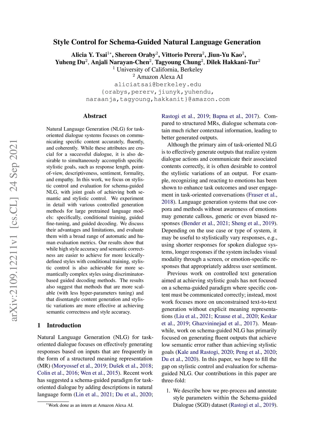 Natural Language Generation (NLG) for task-oriented dialogue systems focuses on communicating specific content accurately, fluently, and coherently. While these attributes are crucial for a successful dialogue, it is also desirable to simultaneously accomplish specific stylistic goals, such as response length, point-of-view, descriptiveness, sentiment, formality, and empathy. In this work, we focus on stylistic control and evaluation for schema-guided NLG, with joint goals of achieving both semantic and stylistic control. We experiment in detail with various controlled generation methods for large pretrained language models: specifically, conditional training, guided fine-tuning, and guided decoding. We discuss their advantages and limitations, and evaluate them with a broad range of automatic and human evaluation metrics. Our results show that while high style accuracy and semantic correctness are easier to achieve for more lexically-defined styles with conditional training, stylistic control is also achievable for more semantically complex styles using discriminator-based guided decoding methods. The results also suggest that methods that are more scalable (with less hyper-parameters tuning) and that disentangle content generation and stylistic variations are more effective at achieving semantic correctness and style accuracy.