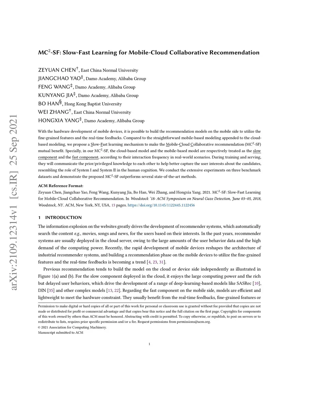 With the hardware development of mobile devices, it is possible to build the recommendation models on the mobile side to utilize the fine-grained features and the real-time feedbacks. Compared to the straightforward mobile-based modeling appended to the cloud-based modeling, we propose a Slow-Fast learning mechanism to make the Mobile-Cloud Collaborative recommendation (MC-SF) mutual benefit. Specially, in our MC-SF, the cloud-based model and the mobile-based model are respectively treated as the slow component and the fast component, according to their interaction frequency in real-world scenarios. During training and serving, they will communicate the prior/privileged knowledge to each other to help better capture the user interests about the candidates, resembling the role of System I and System II in the human cognition. We conduct the extensive experiments on three benchmark datasets and demonstrate the proposed MC-SF outperforms several state-of-the-art methods.