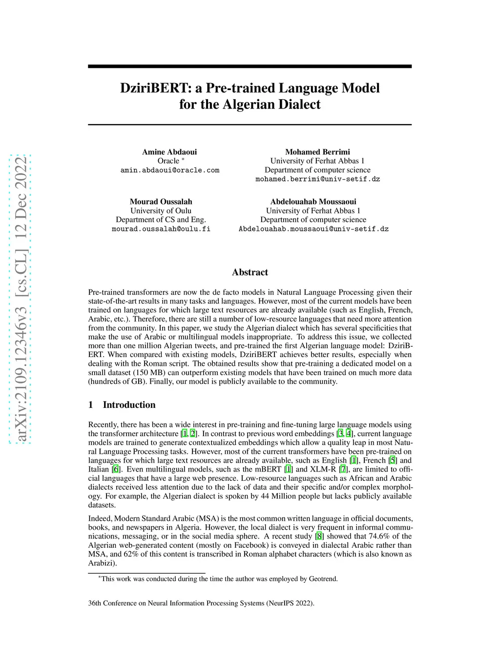DziriBERT: a Pre-trained Language Model for the Algerian Dialect