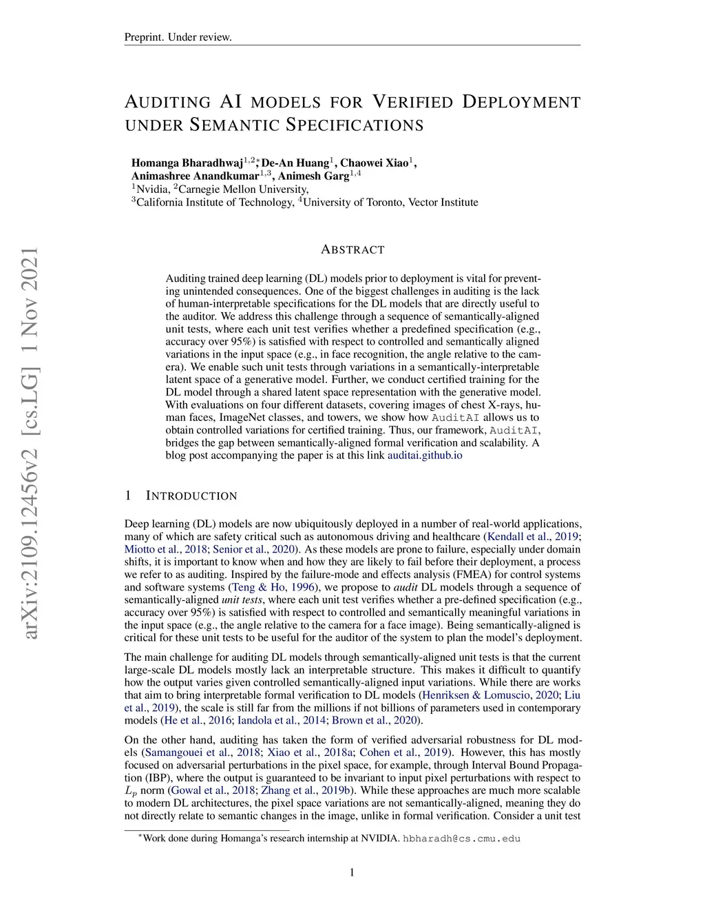 Auditing trained deep learning (DL) models prior to deployment is vital for preventing unintended consequences. One of the biggest challenges in auditing is the lack of human-interpretable specifications for the DL models that are directly useful to the auditor. We address this challenge through a sequence of semantically-aligned unit tests, where each unit test verifies whether a predefined specification (e.g., accuracy over 95%) is satisfied with respect to controlled and semantically aligned variations in the input space (e.g., in face recognition, the angle relative to the camera). We enable such unit tests through variations in a semantically-interpretable latent space of a generative model. Further, we conduct certified training for the DL model through a shared latent space representation with the generative model. With evaluations on four different datasets, covering images of chest X-rays, human faces, ImageNet classes, and towers, we show how AuditAI allows us to obtain controlled variations for certified training. Thus, our framework, AuditAI, bridges the gap between semantically-aligned formal verification and scalability. A blog post accompanying the paper is at this link https://developer.nvidia.com/blog/nvidia-research-auditing-ai-models-for-verified-deployment-under-semantic-specifications