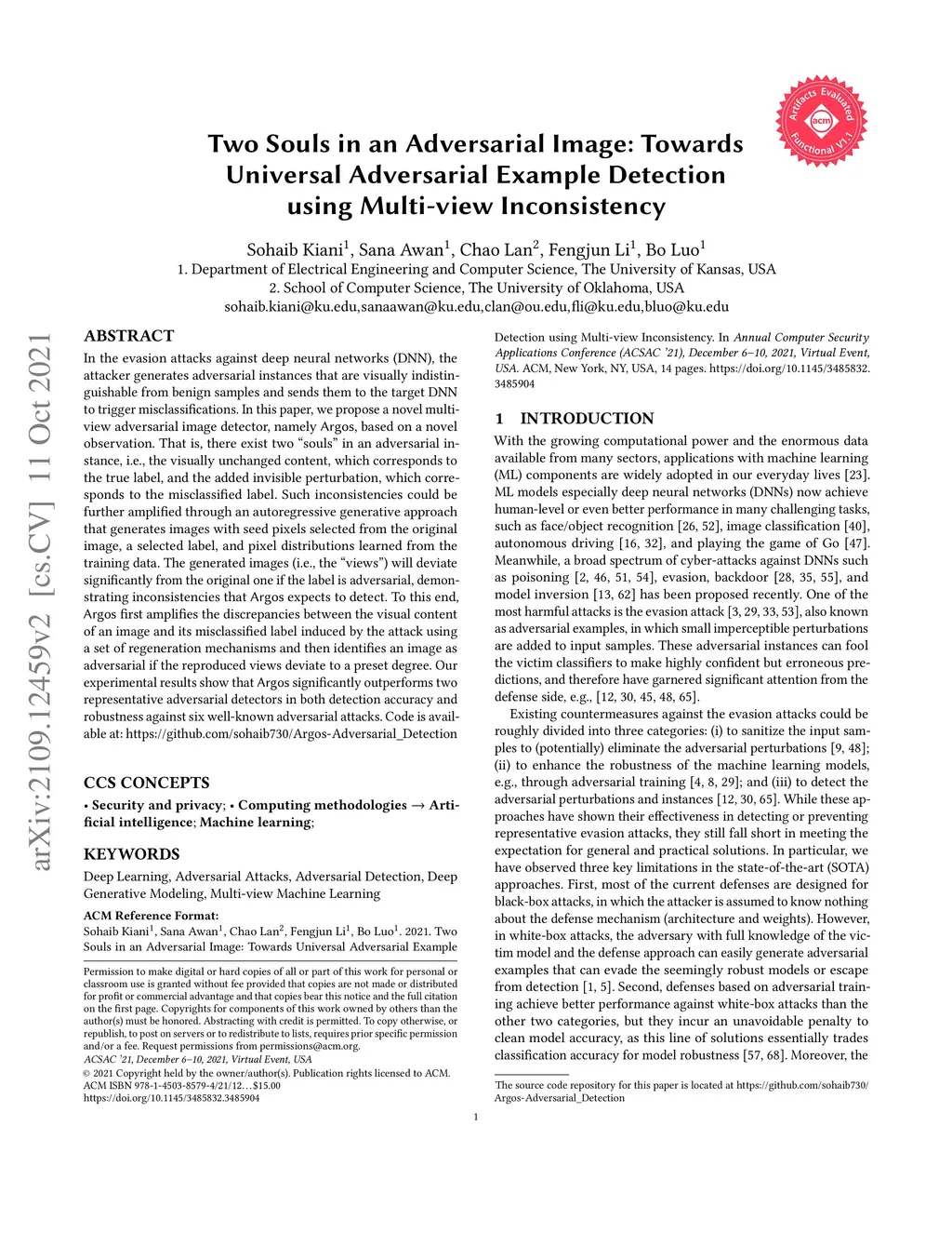 In the evasion attacks against deep neural networks (DNN), the attacker generates adversarial instances that are visually indistinguishable from benign samples and sends them to the target DNN to trigger misclassifications. In this paper, we propose a novel multi-view adversarial image detector, namely Argos, based on a novel observation. That is, there exist two "souls" in an adversarial instance, i.e., the visually unchanged content, which corresponds to the true label, and the added invisible perturbation, which corresponds to the misclassified label. Such inconsistencies could be further amplified through an autoregressive generative approach that generates images with seed pixels selected from the original image, a selected label, and pixel distributions learned from the training data. The generated images (i.e., the "views") will deviate significantly from the original one if the label is adversarial, demonstrating inconsistencies that Argos expects to detect. To this end, Argos first amplifies the discrepancies between the visual content of an image and its misclassified label induced by the attack using a set of regeneration mechanisms and then identifies an image as adversarial if the reproduced views deviate to a preset degree. Our experimental results show that Argos significantly outperforms two representative adversarial detectors in both detection accuracy and robustness against six well-known adversarial attacks. Code is available at: https://github.com/sohaib730/Argos-Adversarial_Detection
