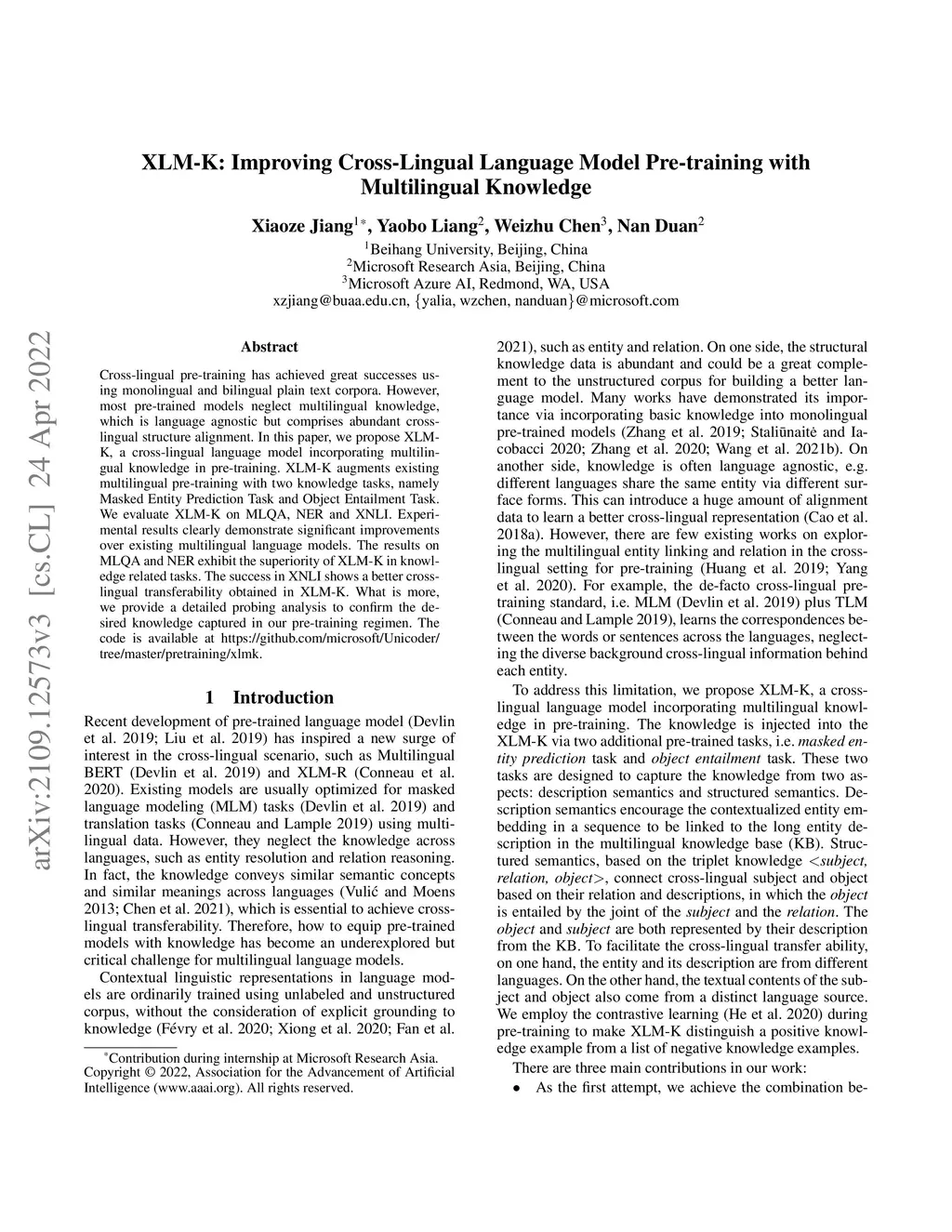 XLM-K: Improving Cross-Lingual Language Model Pre-training with