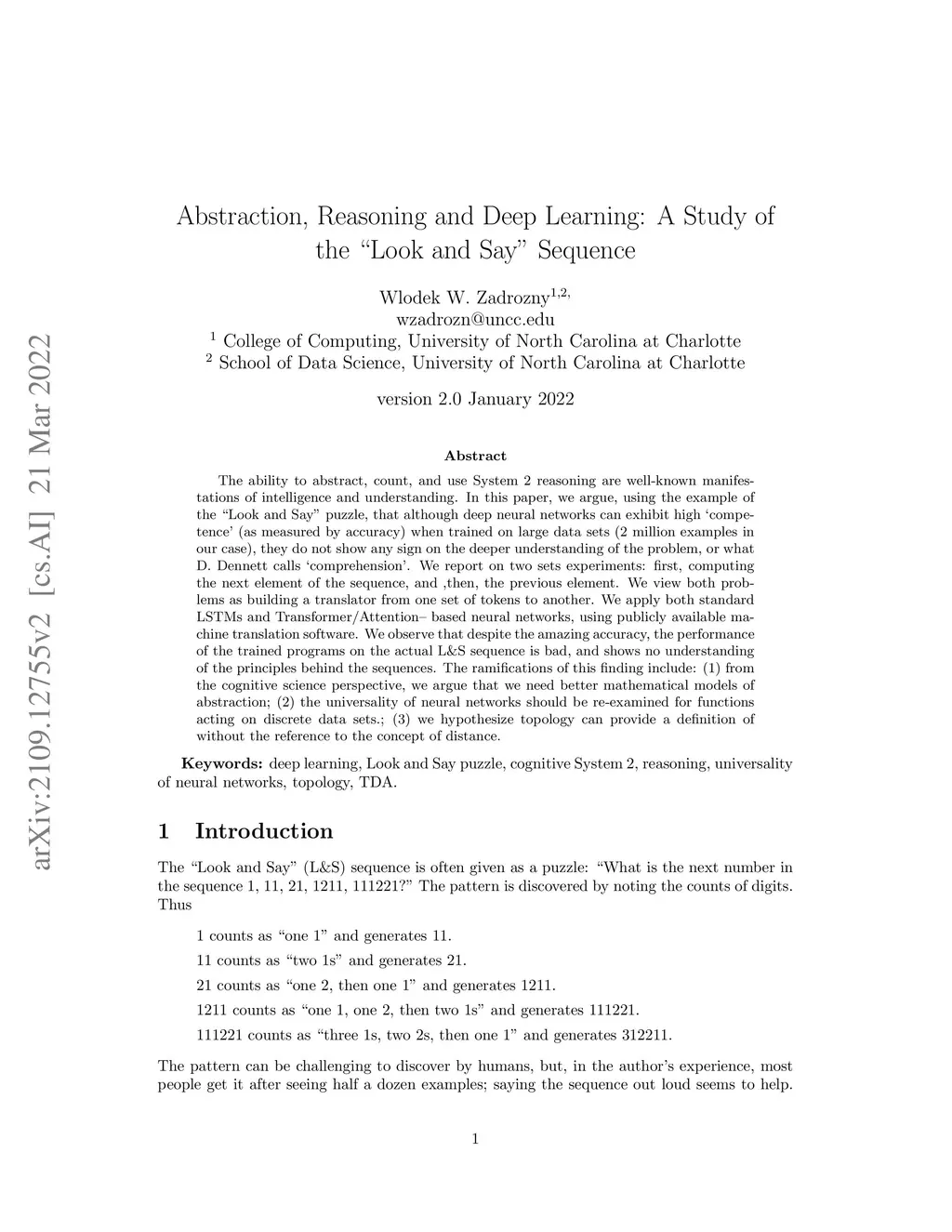 The ability to abstract, count, and use System~2 reasoning are well-known manifestations of intelligence and understanding. In this paper, we argue, using the example of the ``Look and Say" puzzle, that although deep neural networks can exhibit high `competence' (as measured by accuracy) when trained on large data sets (2 million examples in our case), they do not show any sign on the deeper understanding of the problem, or what D. Dennett calls `comprehension'. We report on two sets experiments: first, computing the next element of the sequence, and ,then, the previous element. We view both problems as building a translator from one set of tokens to another. We apply both standard LSTMs and Transformer/Attention-based neural networks, using publicly available machine translation software. We observe that despite the amazing accuracy, the performance of the trained programs on the actual L\&S sequence is bad, and shows no understanding of the principles behind the sequences. The ramifications of this finding include: (1) from the cognitive science perspective, we argue that we need better mathematical models of abstraction; (2) the universality of neural networks should be re-examined for functions acting on discrete data sets; (3) we hypothesize topology can provide a definition of without the reference to the concept of distance.
