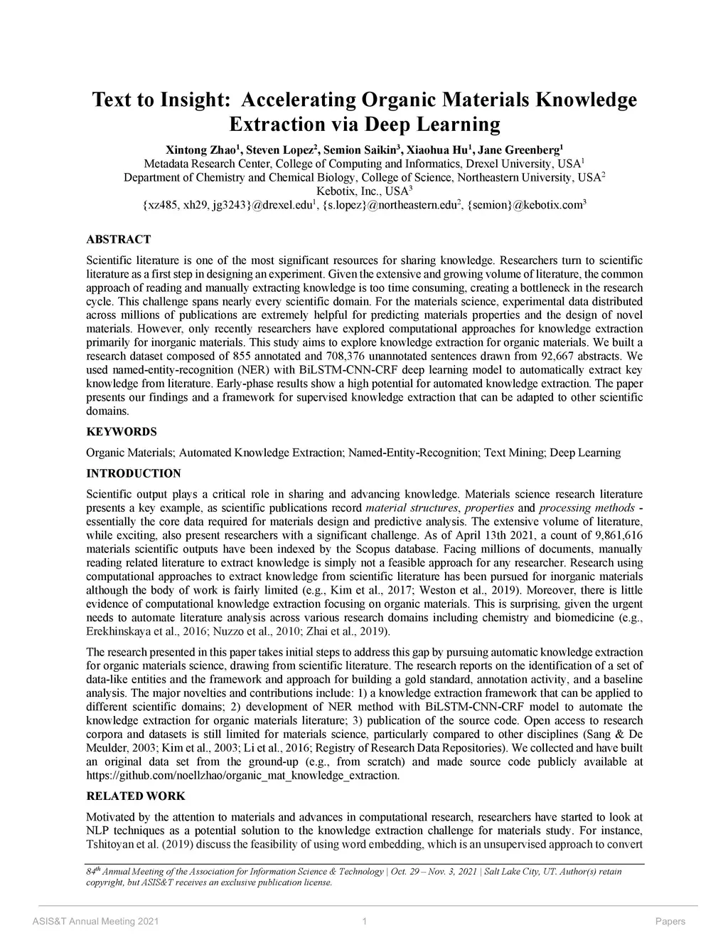Scientific literature is one of the most significant resources for sharing knowledge. Researchers turn to scientific literature as a first step in designing an experiment. Given the extensive and growing volume of literature, the common approach of reading and manually extracting knowledge is too time consuming, creating a bottleneck in the research cycle. This challenge spans nearly every scientific domain. For the materials science, experimental data distributed across millions of publications are extremely helpful for predicting materials properties and the design of novel materials. However, only recently researchers have explored computational approaches for knowledge extraction primarily for inorganic materials. This study aims to explore knowledge extraction for organic materials. We built a research dataset composed of 855 annotated and 708,376 unannotated sentences drawn from 92,667 abstracts. We used named-entity-recognition (NER) with BiLSTM-CNN-CRF deep learning model to automatically extract key knowledge from literature. Early-phase results show a high potential for automated knowledge extraction. The paper presents our findings and a framework for supervised knowledge extraction that can be adapted to other scientific domains.