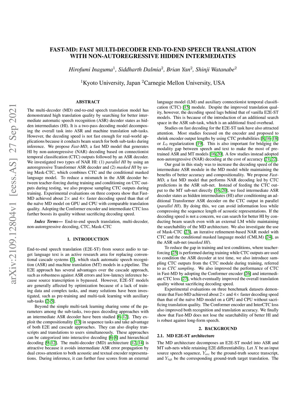 Fast-MD: Fast Multi-Decoder End-to-End Speech Translation with