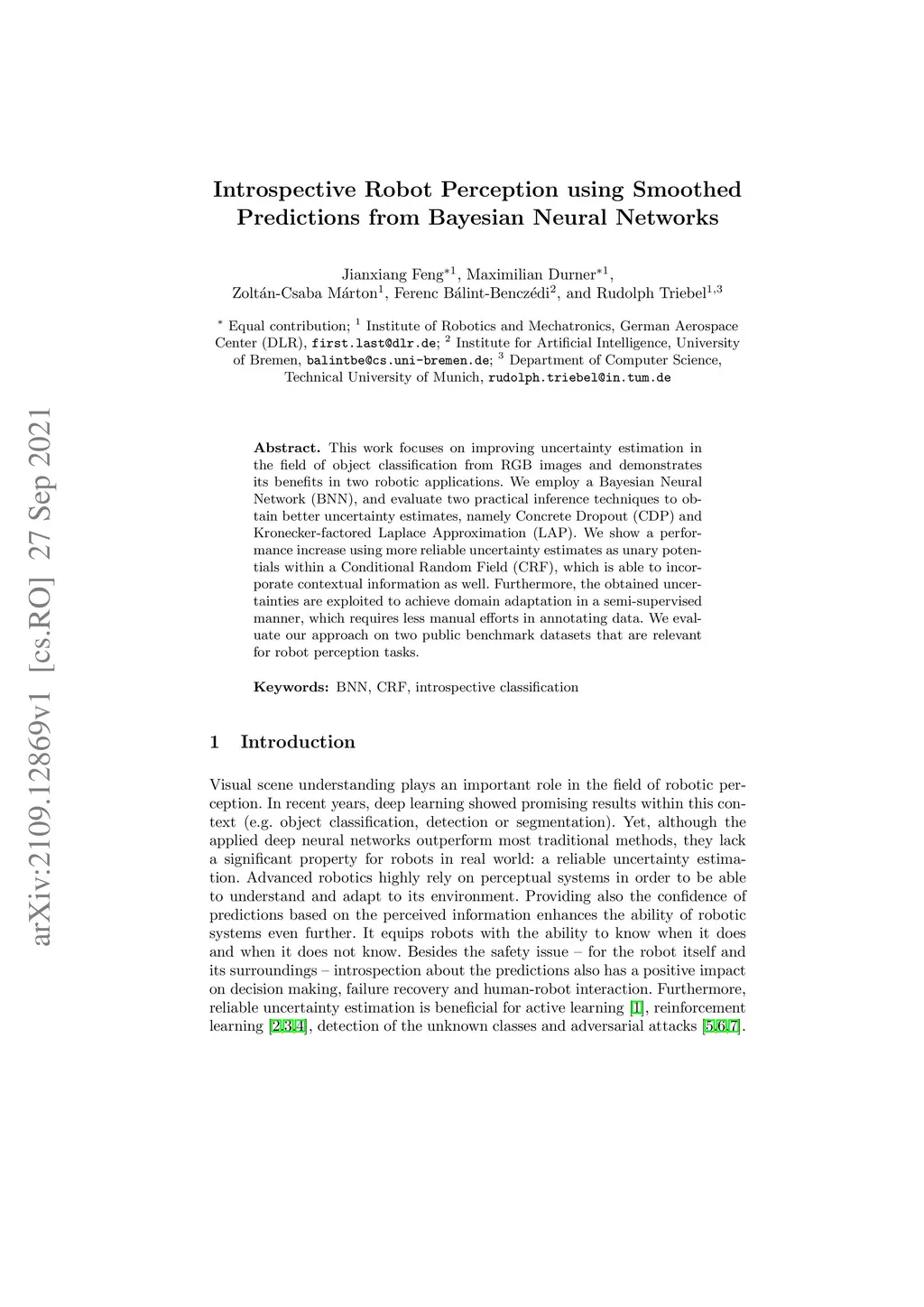 This work focuses on improving uncertainty estimation in the field of object classification from RGB images and demonstrates its benefits in two robotic applications. We employ a (BNN), and evaluate two practical inference techniques to obtain better uncertainty estimates, namely Concrete Dropout (CDP) and Kronecker-factored Laplace Approximation (LAP). We show a performance increase using more reliable uncertainty estimates as unary potentials within a Conditional Random Field (CRF), which is able to incorporate contextual information as well. Furthermore, the obtained uncertainties are exploited to achieve domain adaptation in a semi-supervised manner, which requires less manual efforts in annotating data. We evaluate our approach on two public benchmark datasets that are relevant for robot perception tasks.