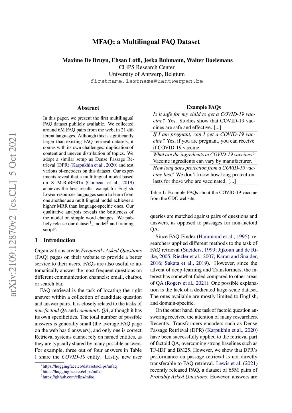 In this paper, we present the first multilingual FAQ dataset publicly available. We collected around 6M FAQ pairs from the web, in 21 different languages. Although this is significantly larger than existing FAQ retrieval datasets, it comes with its own challenges: duplication of content and uneven distribution of topics. We adopt a similar setup as Dense Passage Retrieval (DPR) and test various bi-encoders on this dataset. Our experiments reveal that a multilingual model based on XLM-RoBERTa achieves the best results, except for English. Lower resources languages seem to learn from one another as a multilingual model achieves a higher MRR than language-specific ones. Our qualitative analysis reveals the brittleness of the model on simple word changes. We publicly release our dataset, model and training script.