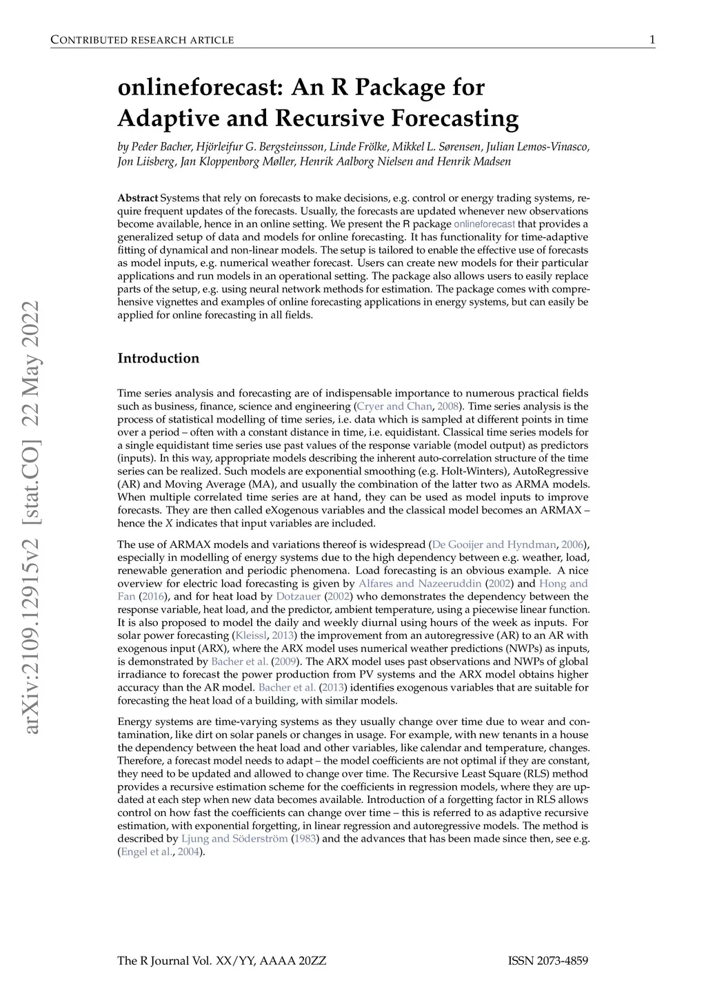 Systems that rely on forecasts to make decisions, e.g. control or energy trading systems, require frequent updates of the forecasts. Usually, the forecasts are updated whenever new observations become available, hence in an online setting. We present the R package onlineforecast that provides a generalized setup of data and models for online forecasting. It has functionality for time-adaptive fitting of dynamical and non-linear models. The setup is tailored to enable the effective use of forecasts as model inputs, e.g. numerical weather forecast. Users can create new models for their particular applications and run models in an operational setting. The package also allows users to easily replace parts of the setup, e.g. using neural network methods for estimation. The package comes with comprehensive vignettes and examples of online forecasting applications in energy systems, but can easily be applied for online forecasting in all fields.