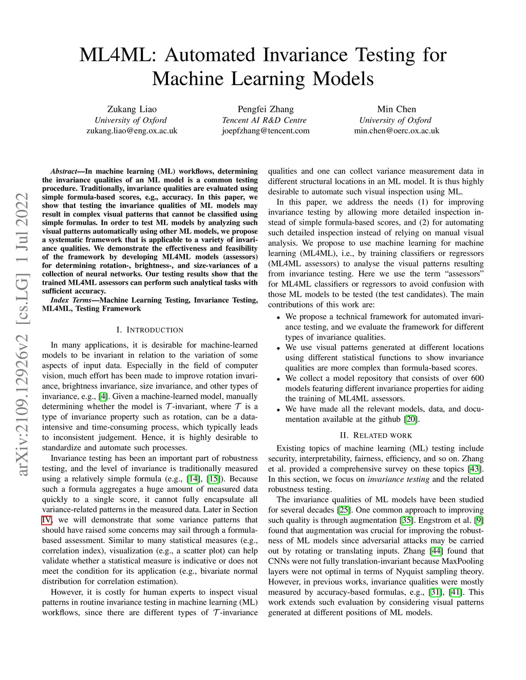 In machine learning (ML) workflows, determining the invariance qualities of an ML model is a common testing procedure. Traditionally, invariance qualities are evaluated using simple formula-based scores, e.g., accuracy. In this paper, we show that testing the invariance qualities of ML models may result in complex visual patterns that cannot be classified using simple formulas. In order to test ML models by analyzing such visual patterns automatically using other ML models, we propose a systematic framework that is applicable to a variety of invariance qualities. We demonstrate the effectiveness and feasibility of the framework by developing ML4ML models (assessors) for determining rotation-, brightness-, and size-variances of a collection of neural networks. Our testing results show that the trained ML4ML assessors can perform such analytical tasks with sufficient accuracy.