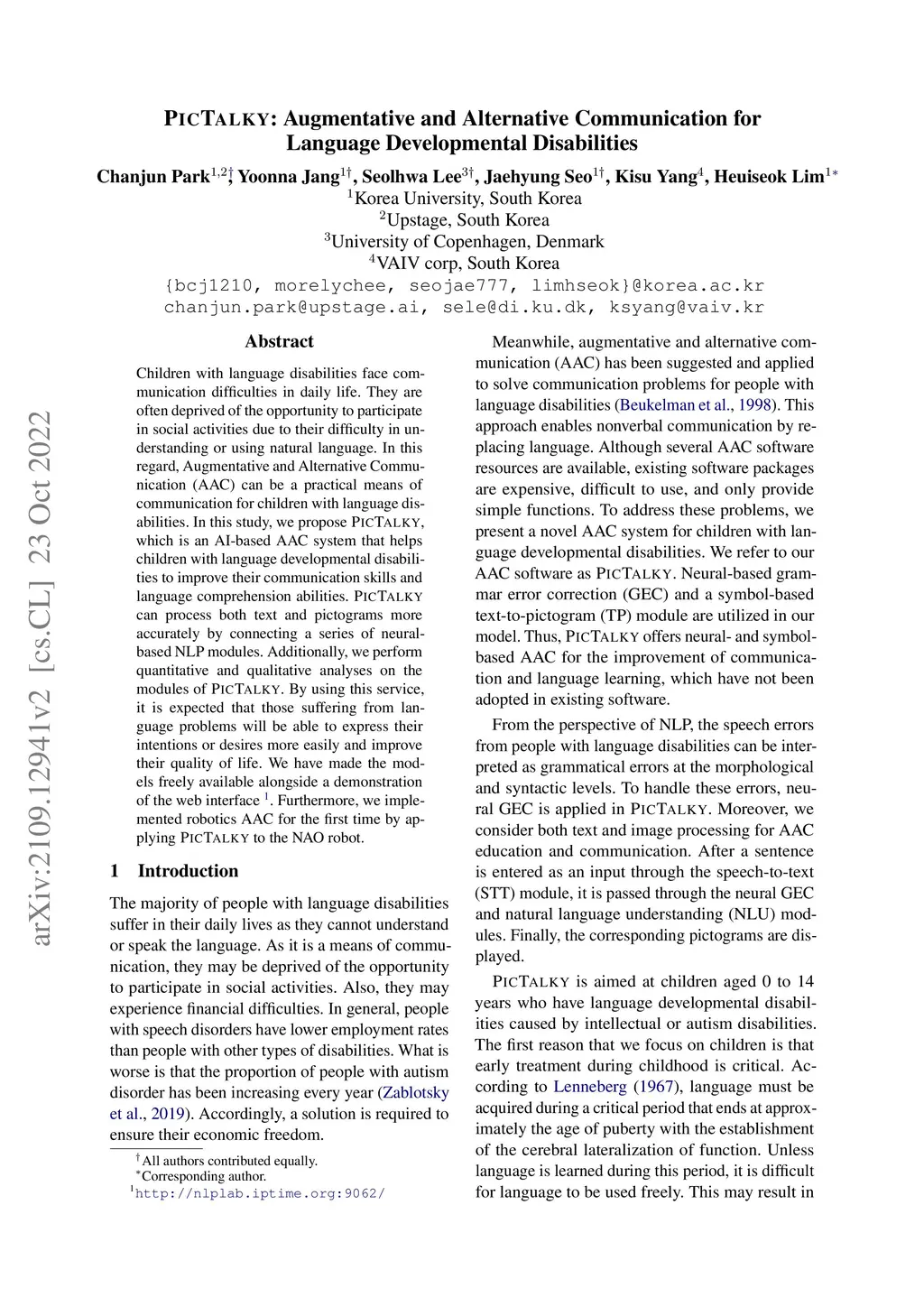 Augmentative and alternative communication (AAC) is a practical means of communication for people with language disabilities. In this study, we propose PicTalky, which is an AI-based AAC system that helps children with language developmental disabilities to improve their communication skills and language comprehension abilities. PicTalky can process both text and pictograms more accurately by connecting a series of neural-based NLP modules. Moreover, we perform quantitative and qualitative analyses on the essential features of PicTalky. It is expected that those suffering from language problems will be able to express their intentions or desires more easily and improve their quality of life by using this service. We have made the models freely available alongside a demonstration of the Web interface. Furthermore, we implemented robotics AAC for the first time by applying PicTalky to the NAO robot.