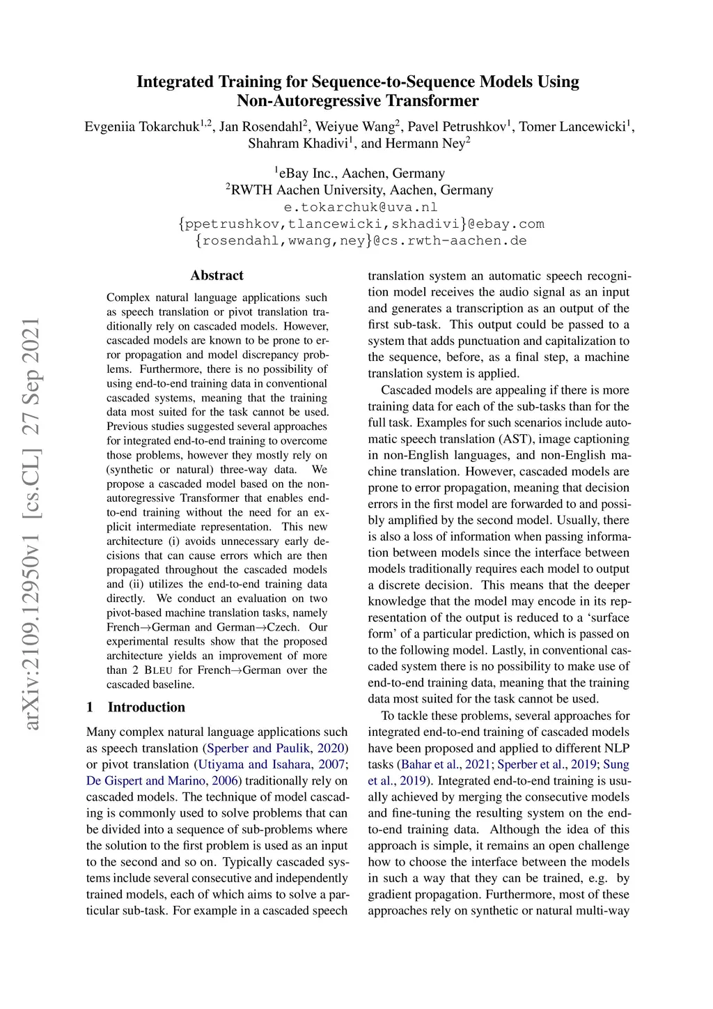 Complex natural language applications such as speech translation or pivot translation traditionally rely on cascaded models. However, cascaded models are known to be prone to error propagation and model discrepancy problems. Furthermore, there is no possibility of using end-to-end training data in conventional cascaded systems, meaning that the training data most suited for the task cannot be used. Previous studies suggested several approaches for integrated end-to-end training to overcome those problems, however they mostly rely on (synthetic or natural) three-way data. We propose a cascaded model based on the non-autoregressive Transformer that enables end-to-end training without the need for an explicit intermediate representation. This new architecture (i) avoids unnecessary early decisions that can cause errors which are then propagated throughout the cascaded models and (ii) utilizes the end-to-end training data directly. We conduct an evaluation on two pivot-based machine translation tasks, namely French-German and German-Czech. Our experimental results show that the proposed architecture yields an improvement of more than 2 BLEU for French-German over the cascaded baseline.