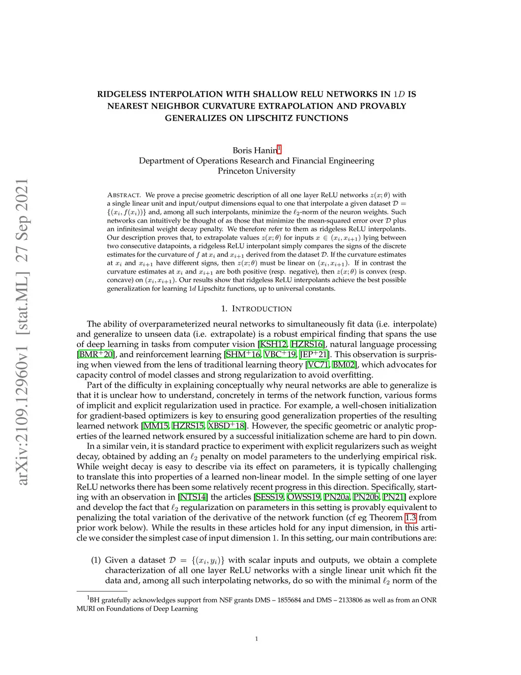 We prove a precise geometric description of all one layer ReLU networks with a single linear unit and input/output dimensions equal to one that interpolate a given dataset and, among all such interpolants, minimize the -norm of the neuron weights. Such networks can intuitively be thought of as those that minimize the mean-squared error over plus an infinitesimal weight decay penalty. We therefore refer to them as ridgeless ReLU interpolants. Our description proves that, to extrapolate values for inputs lying between two consecutive datapoints, a ridgeless ReLU interpolant simply compares the signs of the discrete estimates for the curvature of at and derived from the dataset . If the curvature estimates at and have different signs, then must be linear on . If in contrast the curvature estimates at and are both positive (resp. negative), then is convex (resp. concave) on . Our results show that ridgeless ReLU interpolants achieve the best possible generalization for learning Lipschitz functions, up to universal constants.
