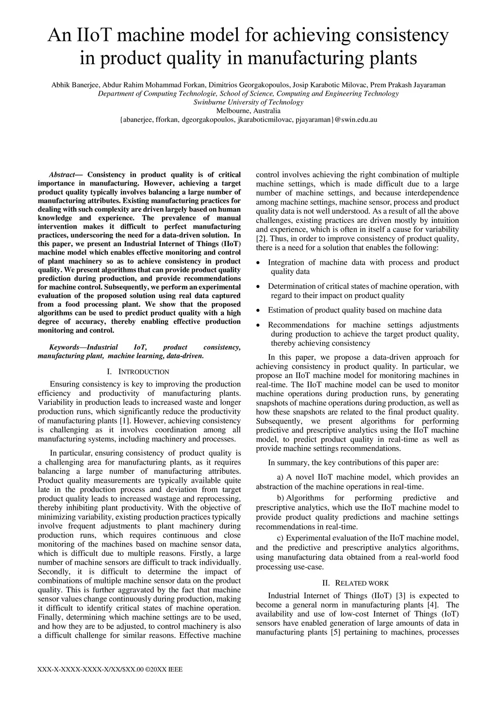 Consistency in product quality is of critical importance in manufacturing. However, achieving a target product quality typically involves balancing a large number of manufacturing attributes. Existing manufacturing practices for dealing with such complexity are driven largely based on human knowledge and experience. The prevalence of manual intervention makes it difficult to perfect manufacturing practices, underscoring the need for a data-driven solution. In this paper, we present an Industrial Internet of Things (IIoT) machine model which enables effective monitoring and control of plant machinery so as to achieve consistency in product quality. We present algorithms that can provide product quality prediction during production, and provide recommendations for machine control. Subsequently, we perform an experimental evaluation of the proposed solution using real data captured from a food processing plant. We show that the proposed algorithms can be used to predict product quality with a high degree of accuracy, thereby enabling effective production monitoring and control.