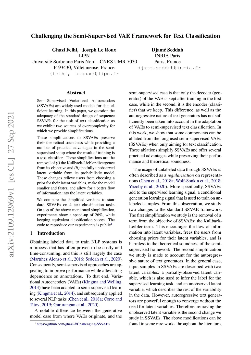 Semi-Supervised Variational Autoencoders (SSVAEs) are widely used models for data efficient learning. In this paper, we question the adequacy of the standard design of sequence SSVAEs for the task of text classification as we exhibit two sources of overcomplexity for which we provide simplifications. These simplifications to SSVAEs preserve their theoretical soundness while providing a number of practical advantages in the semi-supervised setup where the result of training is a text classifier. These simplifications are the removal of (i) the Kullback-Liebler divergence from its objective and (ii) the fully unobserved latent variable from its probabilistic model. These changes relieve users from choosing a prior for their latent variables, make the model smaller and faster, and allow for a better flow of information into the latent variables. We compare the simplified versions to standard SSVAEs on 4 text classification tasks. On top of the above-mentioned simplification, experiments show a speed-up of 26%, while keeping equivalent classification scores. The code to reproduce our experiments is public.