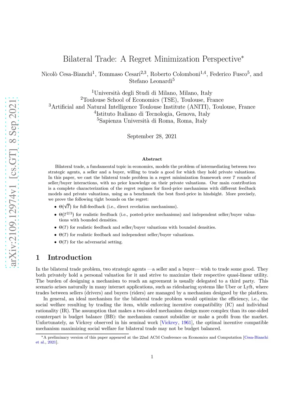 Bilateral trade, a fundamental topic in economics, models the problem of intermediating between two strategic agents, a seller and a buyer, willing to trade a good for which they hold private valuations. In this paper, we cast the bilateral trade problem in a regret minimization framework over rounds of seller/buyer interactions, with no prior knowledge on their private valuations. Our main contribution is a complete characterization of the regret regimes for fixed-price mechanisms with different feedback models and private valuations, using as a benchmark the best fixed-price in hindsight. More precisely, we prove the following tight bounds on the regret: - for full-feedback (i.e., direct revelation mechanisms). - for realistic feedback (i.e., posted-price mechanisms) and independent seller/buyer valuations with bounded densities. - for realistic feedback and seller/buyer valuations with bounded densities. - for realistic feedback and independent seller/buyer valuations. - for the adversarial setting.