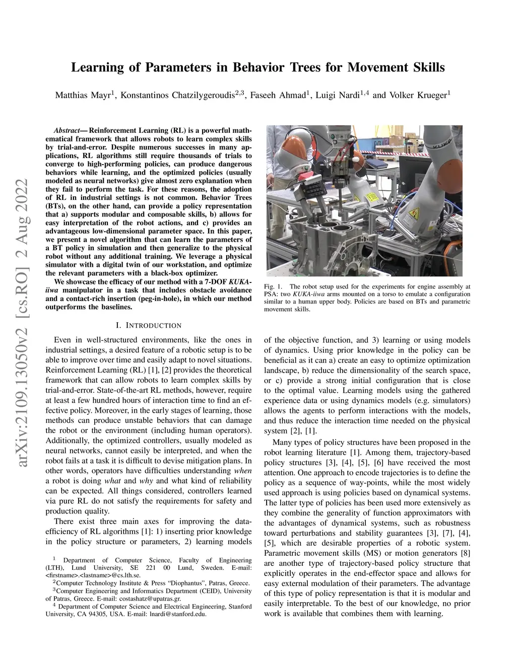 Reinforcement Learning (RL) is a powerful mathematical framework that allows robots to learn complex skills by trial-and-error. Despite numerous successes in many applications, RL algorithms still require thousands of trials to converge to high-performing policies, can produce dangerous behaviors while learning, and the optimized policies (usually modeled as neural networks) give almost zero explanation when they fail to perform the task. For these reasons, the adoption of RL in industrial settings is not common. Behavior Trees (BTs), on the other hand, can provide a policy representation that a) supports modular and composable skills, b) allows for easy interpretation of the robot actions, and c) provides an advantageous low-dimensional parameter space. In this paper, we present a novel algorithm that can learn the parameters of a BT policy in simulation and then generalize to the physical robot without any additional training. We leverage a physical simulator with a digital twin of our workstation, and optimize the relevant parameters with a black-box optimizer. We showcase the efficacy of our method with a 7-DOF KUKA-iiwa manipulator in a task that includes obstacle avoidance and a contact-rich insertion (peg-in-hole), in which our method outperforms the baselines.