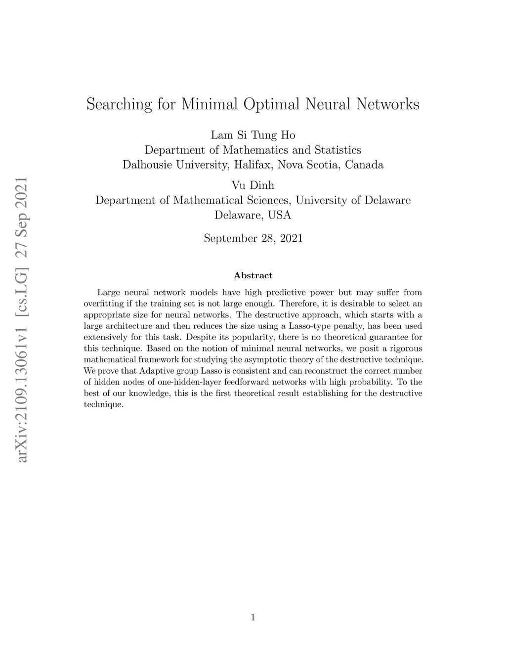 Large neural network models have high predictive power but may suffer from overfitting if the training set is not large enough. Therefore, it is desirable to select an appropriate size for neural networks. The destructive approach, which starts with a large architecture and then reduces the size using a Lasso-type penalty, has been used extensively for this task. Despite its popularity, there is no theoretical guarantee for this technique. Based on the notion of minimal neural networks, we posit a rigorous mathematical framework for studying the asymptotic theory of the destructive technique. We prove that Adaptive group Lasso is consistent and can reconstruct the correct number of hidden nodes of one-hidden-layer feedforward networks with high probability. To the best of our knowledge, this is the first theoretical result establishing for the destructive technique.