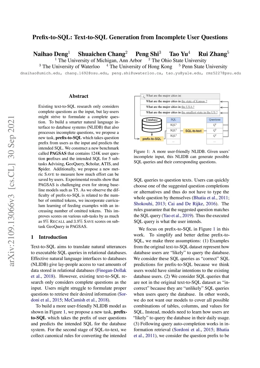 Existing text-to-SQL research only considers complete questions as the input, but lay-users might strive to formulate a complete question. To build a smarter natural language interface to database systems (NLIDB) that also processes incomplete questions, we propose a new task, prefix-to-SQL which takes question prefix from users as the input and predicts the intended SQL. We construct a new benchmark called PAGSAS that contains 124K user question prefixes and the intended SQL for 5 sub-tasks Advising, GeoQuery, Scholar, ATIS, and Spider. Additionally, we propose a new metric SAVE to measure how much effort can be saved by users. Experimental results show that PAGSAS is challenging even for strong baseline models such as T5. As we observe the difficulty of prefix-to-SQL is related to the number of omitted tokens, we incorporate curriculum learning of feeding examples with an increasing number of omitted tokens. This improves scores on various sub-tasks by as much as 9% recall scores on sub-task GeoQuery in PAGSAS.