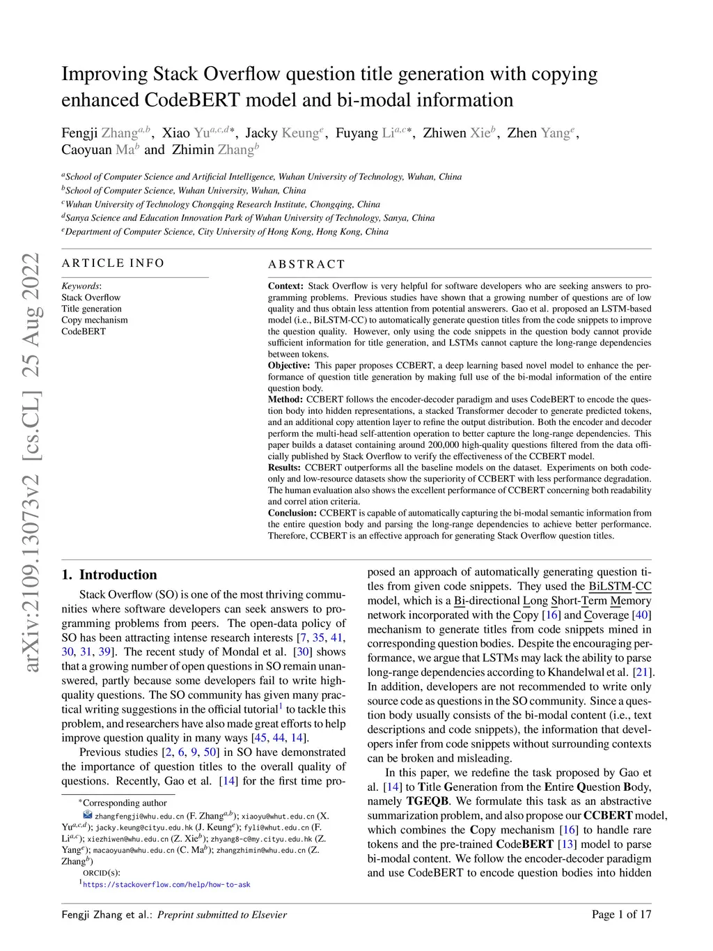 Context: Stack Overflow is very helpful for software developers who are seeking answers to programming problems. Previous studies have shown that a growing number of questions are of low quality and thus obtain less attention from potential answerers. Gao et al. proposed an LSTM-based model (i.e., BiLSTM-CC) to automatically generate question titles from the code snippets to improve the question quality. However, only using the code snippets in the question body cannot provide sufficient information for title generation, and LSTMs cannot capture the long-range dependencies between tokens. Objective: This paper proposes CCBERT, a deep learning based novel model to enhance the performance of question title generation by making full use of the bi-modal information of the entire question body. Method: CCBERT follows the encoder-decoder paradigm and uses CodeBERT to encode the question body into hidden representations, a stacked Transformer decoder to generate predicted tokens, and an additional copy attention layer to refine the output distribution. Both the encoder and decoder perform the multi-head self-attention operation to better capture the long-range dependencies. This paper builds a dataset containing around 200,000 high-quality questions filtered from the data officially published by Stack Overflow to verify the effectiveness of the CCBERT model. Results: CCBERT outperforms all the baseline models on the dataset. Experiments on both code-only and low-resource datasets show the superiority of CCBERT with less performance degradation. The human evaluation also shows the excellent performance of CCBERT concerning both readability and correlation criteria.