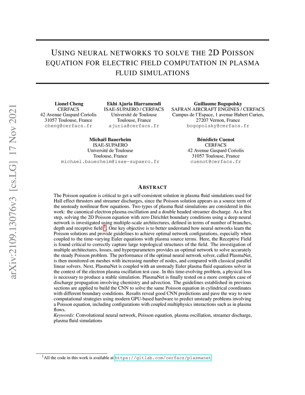 The Poisson equation is critical to get a self-consistent solution in plasma fluid simulations used for Hall effect thrusters and streamer discharges, since the Poisson solution appears as a source term of the unsteady nonlinear flow equations. As a first step, solving the 2D Poisson equation with zero Dirichlet boundary conditions using a deep neural network is investigated using multiple-scale architectures, defined in terms of number of branches, depth and receptive field. One key objective is to better understand how neural networks learn the Poisson solutions and provide guidelines to achieve optimal network configurations, especially when coupled to the time-varying Euler equations with plasma source terms. Here, the Receptive Field is found critical to correctly capture large topological structures of the field. The investigation of multiple architectures, losses, and hyperparameters provides an optimal network to solve accurately the steady Poisson problem. The performance of the optimal neural network solver, called PlasmaNet, is then monitored on meshes with increasing number of nodes, and compared with classical parallel linear solvers. Next, PlasmaNet is coupled with an unsteady Euler plasma fluid equations solver in the context of the electron plasma oscillation test case. In this time-evolving problem, a physical loss is necessary to produce a stable simulation. PlasmaNet is finally tested on a more complex case of discharge propagation involving chemistry and advection. The guidelines established in previous sections are applied to build the CNN to solve the same Poisson equation in cylindrical coordinates with different boundary conditions. Results reveal good CNN predictions and pave the way to new computational strategies using modern GPU-based hardware to predict unsteady problems involving a Poisson equation.
