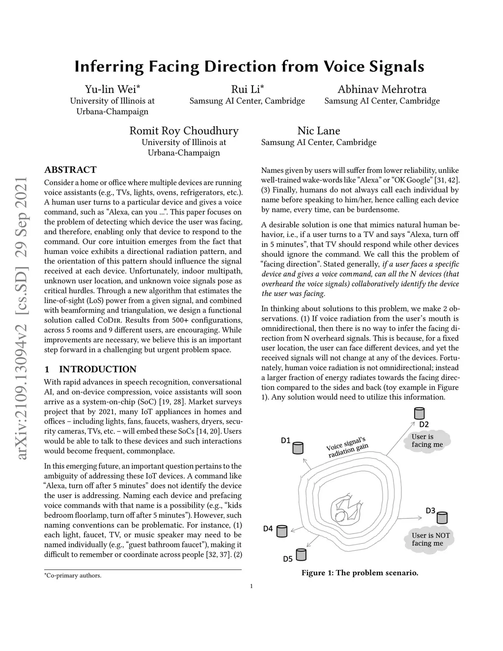 Consider a home or office where multiple devices are running voice assistants (e.g., TVs, lights, ovens, refrigerators, etc.). A human user turns to a particular device and gives a voice command, such as ``Alexa, can you ...''. This paper focuses on the problem of detecting which device the user was facing, and therefore, enabling only that device to respond to the command. Our core intuition emerges from the fact that human voice exhibits a directional radiation pattern, and the orientation of this pattern should influence the signal received at each device. Unfortunately, indoor multipath, unknown user location, and unknown voice signals pose as critical hurdles. Through a new algorithm that estimates the line-of-sight (LoS) power from a given signal, and combined with beamforming and triangulation, we design a functional solution called CoDIR. Results from configurations, across rooms and different users, are encouraging. While improvements are necessary, we believe this is an important step forward in a challenging but urgent problem space.