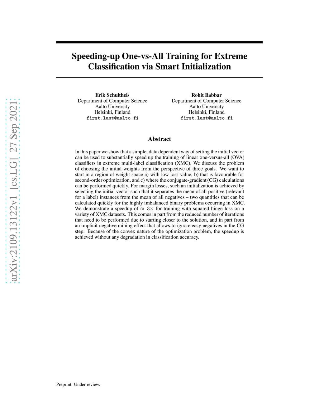 In this paper we show that a simple, data dependent way of setting the initial vector can be used to substantially speed up the training of linear one-versus-all (OVA) classifiers in extreme multi-label classification (XMC). We discuss the problem of choosing the initial weights from the perspective of three goals. We want to start in a region of weight space a) with low loss value, b) that is favourable for second-order optimization, and c) where the conjugate-gradient (CG) calculations can be performed quickly. For margin losses, such an initialization is achieved by selecting the initial vector such that it separates the mean of all positive (relevant for a label) instances from the mean of all negatives -- two quantities that can be calculated quickly for the highly imbalanced binary problems occurring in XMC. We demonstrate a speedup of for training with squared hinge loss on a variety of XMC datasets. This comes in part from the reduced number of iterations that need to be performed due to starting closer to the solution, and in part from an implicit negative mining effect that allows to ignore easy negatives in the CG step. Because of the convex nature of the optimization problem, the speedup is achieved without any degradation in classification accuracy.