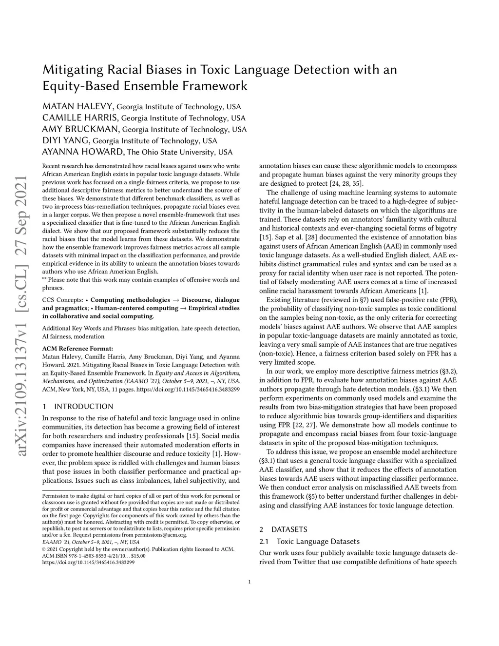 Recent research has demonstrated how racial biases against users who write African American English exists in popular toxic language datasets. While previous work has focused on a single fairness criteria, we propose to use additional descriptive fairness metrics to better understand the source of these biases. We demonstrate that different benchmark classifiers, as well as two in-process bias-remediation techniques, propagate racial biases even in a larger corpus. We then propose a novel ensemble-framework that uses a specialized classifier that is fine-tuned to the African American English dialect. We show that our proposed framework substantially reduces the racial biases that the model learns from these datasets. We demonstrate how the ensemble framework improves fairness metrics across all sample datasets with minimal impact on the classification performance, and provide empirical evidence in its ability to unlearn the annotation biases towards authors who use African American English. ** Please note that this work may contain examples of offensive words and phrases.
