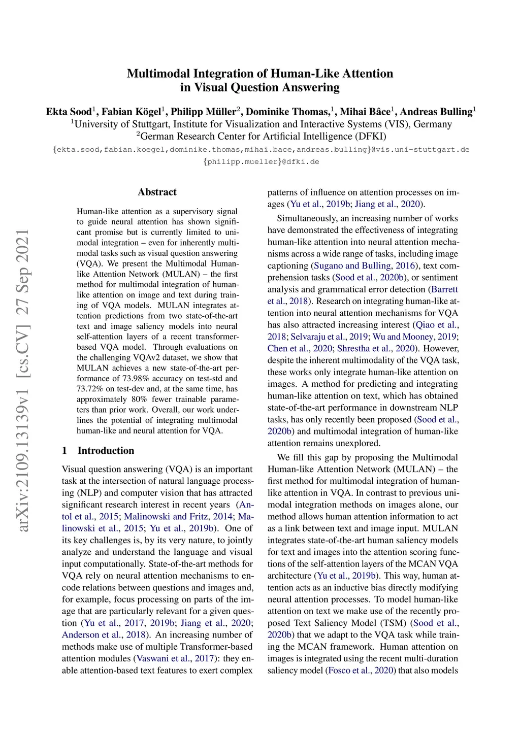 Human-like attention as a supervisory signal to guide neural attention has shown significant promise but is currently limited to uni-modal integration - even for inherently multimodal tasks such as visual question answering (VQA). We present the Multimodal Human-like Attention Network (MULAN) - the first method for multimodal integration of human-like attention on image and text during training of VQA models. MULAN integrates attention predictions from two state-of-the-art text and image saliency models into neural self-attention layers of a recent transformer-based VQA model. Through evaluations on the challenging VQAv2 dataset, we show that MULAN achieves a new state-of-the-art performance of 73.98% accuracy on test-std and 73.72% on test-dev and, at the same time, has approximately 80% fewer trainable parameters than prior work. Overall, our work underlines the potential of integrating multimodal human-like and neural attention for VQA