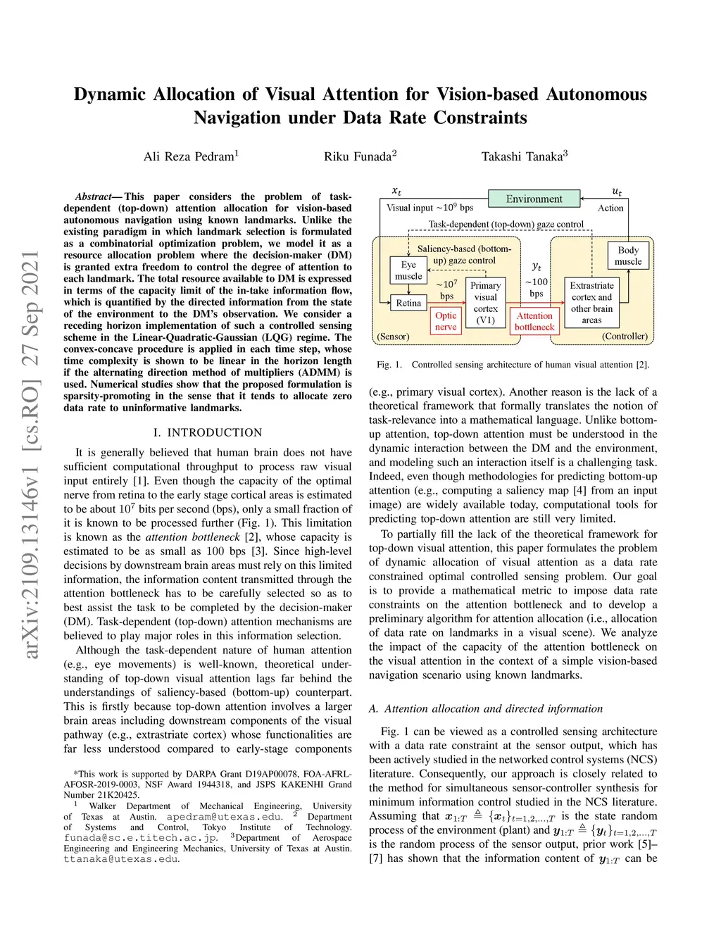 This paper considers the problem of task-dependent (top-down) attention allocation for vision-based autonomous navigation using known landmarks. Unlike the existing paradigm in which landmark selection is formulated as a combinatorial optimization problem, we model it as a resource allocation problem where the decision-maker (DM) is granted extra freedom to control the degree of attention to each landmark. The total resource available to DM is expressed in terms of the capacity limit of the in-take information flow, which is quantified by the directed information from the state of the environment to the DM's observation. We consider a receding horizon implementation of such a controlled sensing scheme in the Linear-Quadratic-Gaussian (LQG) regime. The convex-concave procedure is applied in each time step, whose time complexity is shown to be linear in the horizon length if the alternating direction method of multipliers (ADMM) is used. Numerical studies show that the proposed formulation is sparsity-promoting in the sense that it tends to allocate zero data rate to uninformative landmarks.