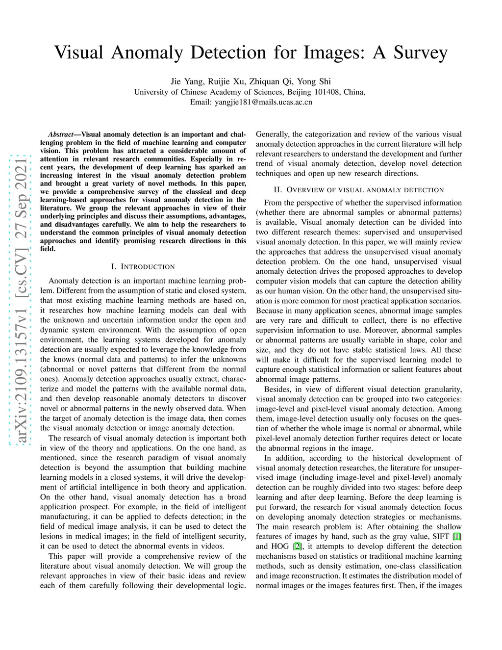Visual anomaly detection is an important and challenging problem in the field of machine learning and computer vision. This problem has attracted a considerable amount of attention in relevant research communities. Especially in recent years, the development of deep learning has sparked an increasing interest in the visual anomaly detection problem and brought a great variety of novel methods. In this paper, we provide a comprehensive survey of the classical and deep learning-based approaches for visual anomaly detection in the literature. We group the relevant approaches in view of their underlying principles and discuss their assumptions, advantages, and disadvantages carefully. We aim to help the researchers to understand the common principles of visual anomaly detection approaches and identify promising research directions in this field.