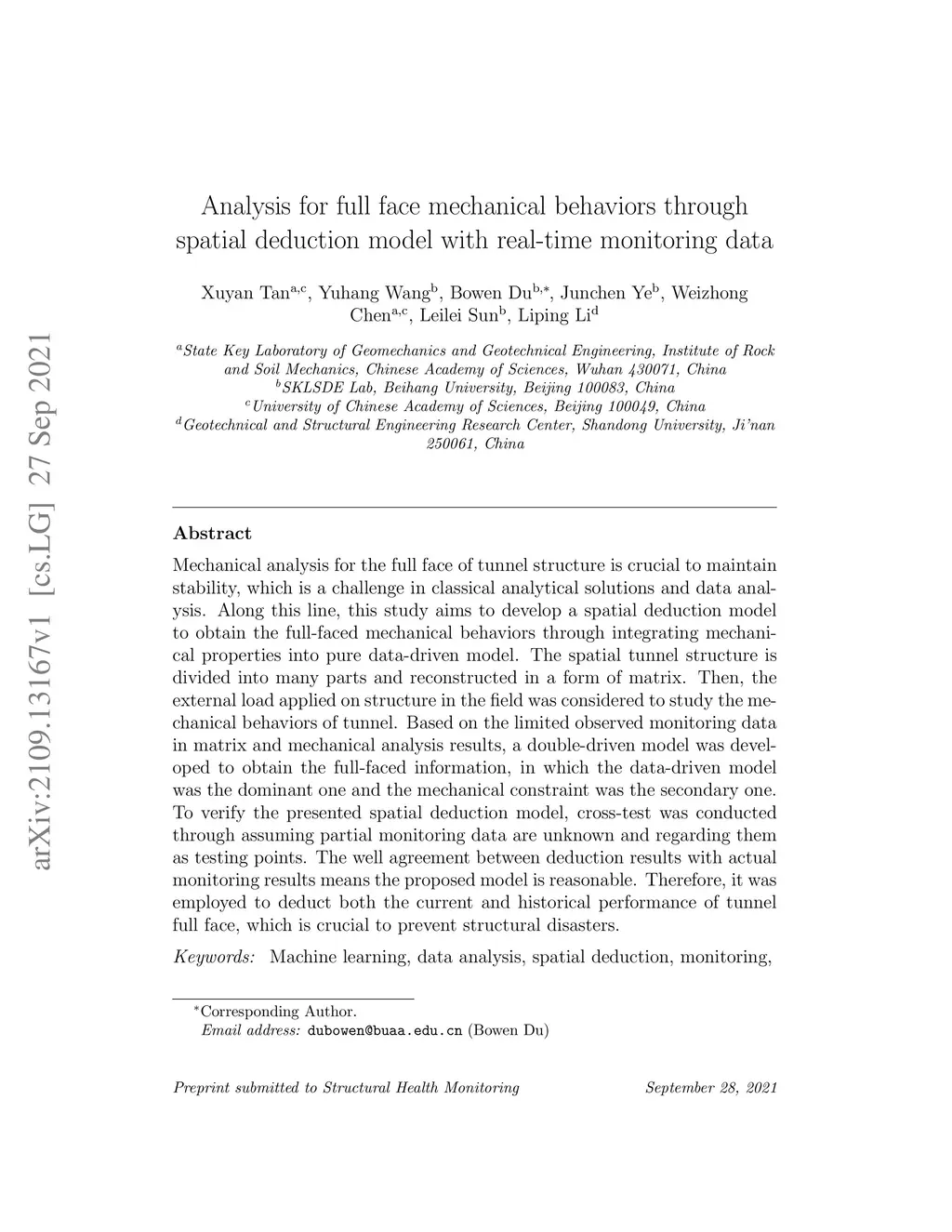 Mechanical analysis for the full face of tunnel structure is crucial to maintain stability, which is a challenge in classical analytical solutions and data analysis. Along this line, this study aims to develop a spatial deduction model to obtain the full-faced mechanical behaviors through integrating mechanical properties into pure data-driven model. The spatial tunnel structure is divided into many parts and reconstructed in a form of matrix. Then, the external load applied on structure in the field was considered to study the mechanical behaviors of tunnel. Based on the limited observed monitoring data in matrix and mechanical analysis results, a double-driven model was developed to obtain the full-faced information, in which the data-driven model was the dominant one and the mechanical constraint was the secondary one. To verify the presented spatial deduction model, cross-test was conducted through assuming partial monitoring data are unknown and regarding them as testing points. The well agreement between deduction results with actual monitoring results means the proposed model is reasonable. Therefore, it was employed to deduct both the current and historical performance of tunnel full face, which is crucial to prevent structural disasters.