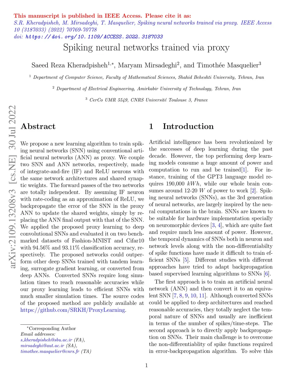 Spiking neural networks trained via proxy
