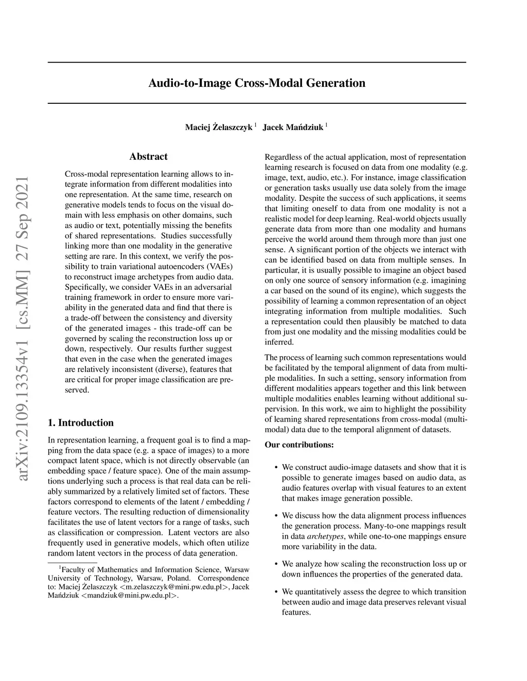 Cross-modal representation learning allows to integrate information from different modalities into one representation. At the same time, research on generative models tends to focus on the visual domain with less emphasis on other domains, such as audio or text, potentially missing the benefits of shared representations. Studies successfully linking more than one modality in the generative setting are rare. In this context, we verify the possibility to train variational autoencoders (VAEs) to reconstruct image archetypes from audio data. Specifically, we consider VAEs in an adversarial training framework in order to ensure more variability in the generated data and find that there is a trade-off between the consistency and diversity of the generated images - this trade-off can be governed by scaling the reconstruction loss up or down, respectively. Our results further suggest that even in the case when the generated images are relatively inconsistent (diverse), features that are critical for proper image classification are preserved.
