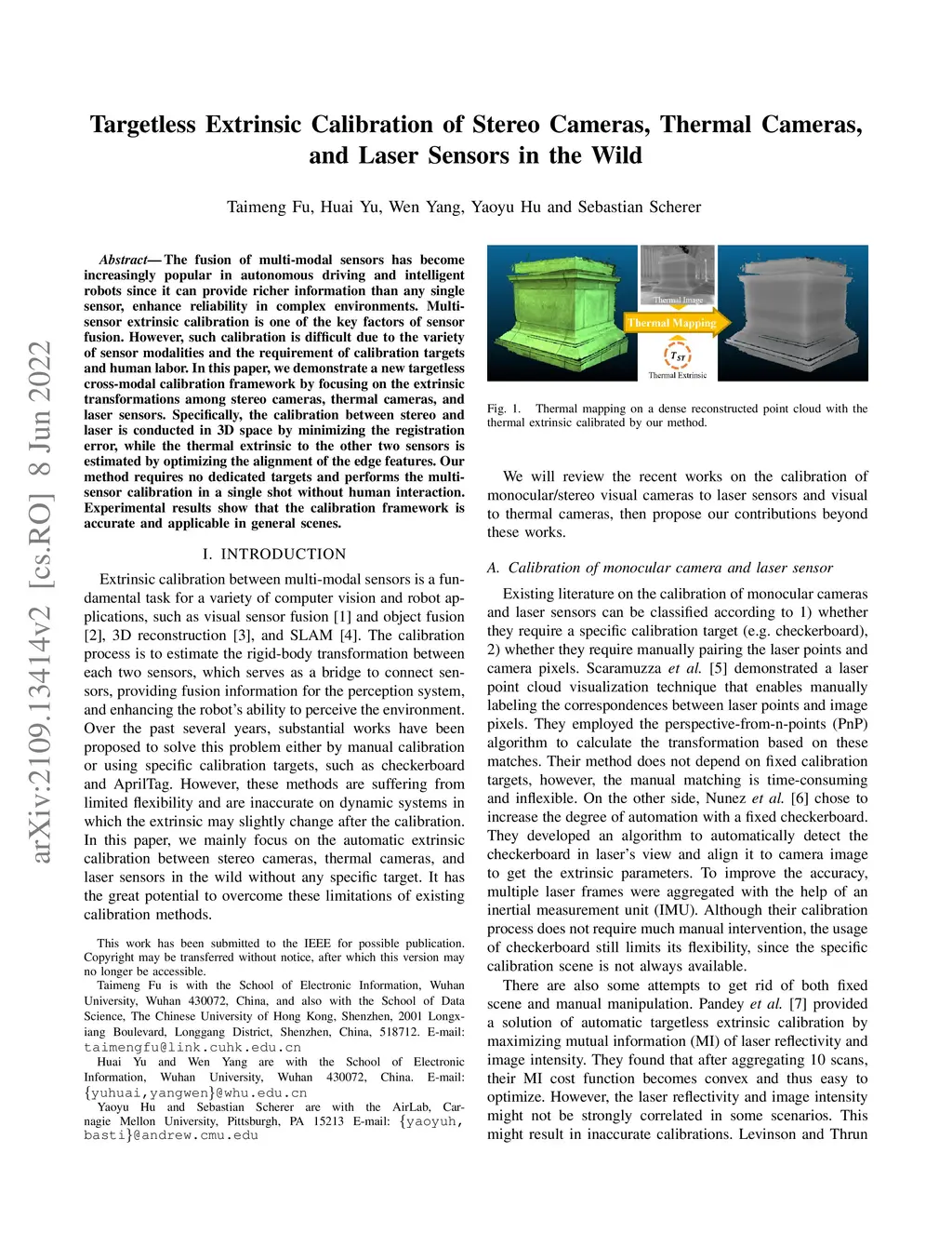 The fusion of multi-modal sensors has become increasingly popular in autonomous driving and intelligent robots since it can provide richer information than any single sensor, enhance reliability in complex environments. Multi-sensor extrinsic calibration is one of the key factors of sensor fusion. However, such calibration is difficult due to the variety of sensor modalities and the requirement of calibration targets and human labor. In this paper, we demonstrate a new targetless cross-modal calibration framework by focusing on the extrinsic transformations among stereo cameras, thermal cameras, and laser sensors. Specifically, the calibration between stereo and laser is conducted in 3D space by minimizing the registration error, while the thermal extrinsic to the other two sensors is estimated by optimizing the alignment of the edge features. Our method requires no dedicated targets and performs the multi-sensor calibration in a single shot without human interaction. Experimental results show that the calibration framework is accurate and applicable in general scenes.