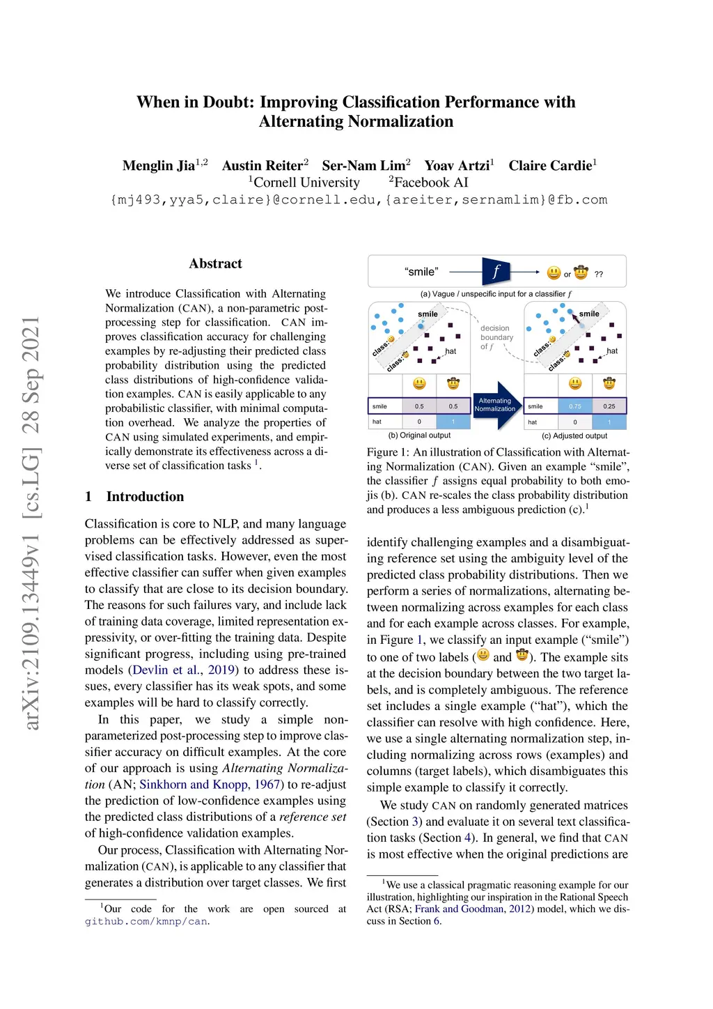 We introduce Classification with Alternating Normalization (CAN), a non-parametric post-processing step for classification. CAN improves classification accuracy for challenging examples by re-adjusting their predicted class probability distribution using the predicted class distributions of high-confidence validation examples. CAN is easily applicable to any probabilistic classifier, with minimal computation overhead. We analyze the properties of CAN using simulated experiments, and empirically demonstrate its effectiveness across a diverse set of classification tasks.
