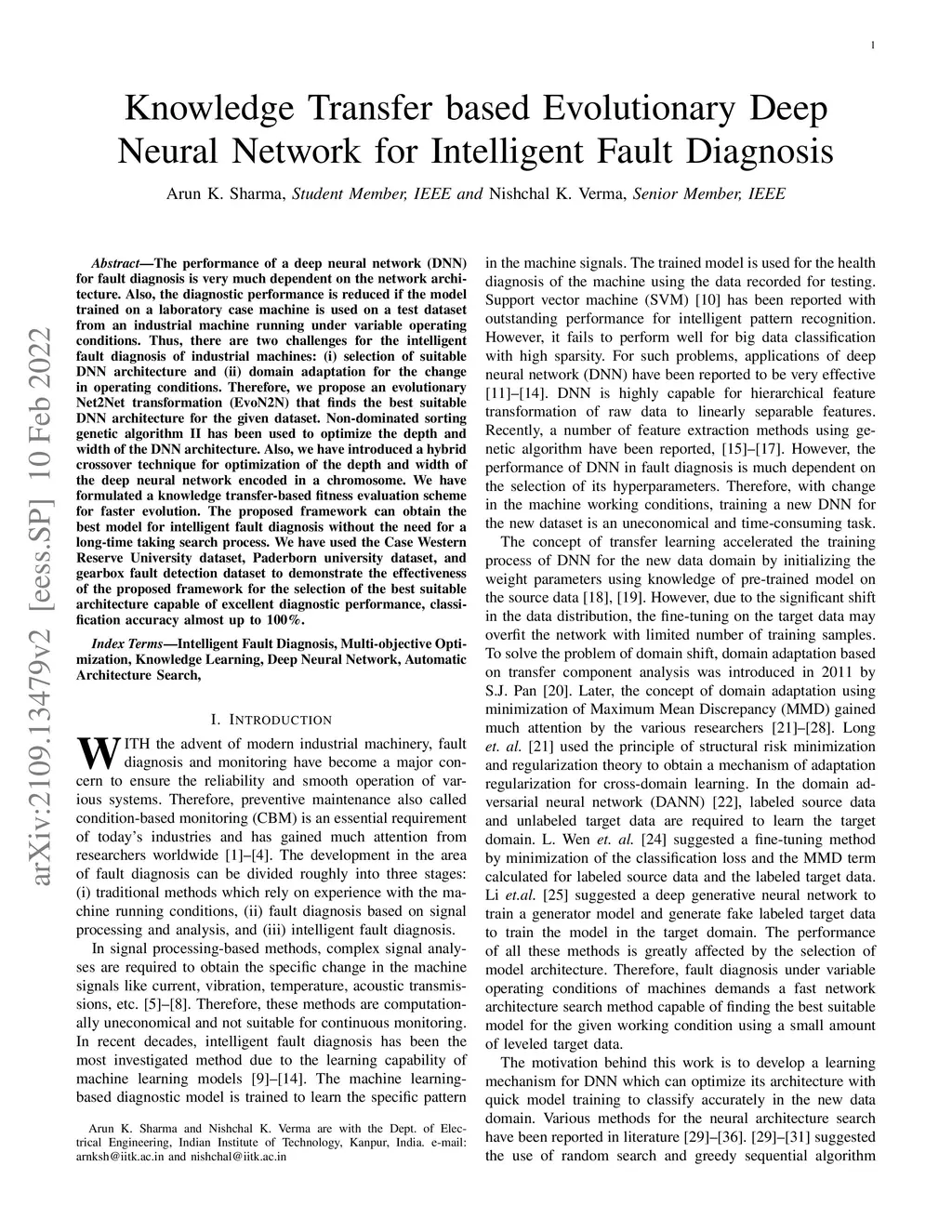 A faster response with commendable accuracy in intelligent systems is essential for the reliability and smooth operations of industrial machines. Two main challenges affect the design of such intelligent systems: (i) the selection of a suitable model and (ii) domain adaptation if there is a continuous change in operating conditions. Therefore, we propose an evolutionary Net2Net transformation (EvoN2N) that finds the best suitable DNN architecture with limited availability of labeled data samples. Net2Net transformation-based quick learning algorithm has been used in the evolutionary framework of Non-dominated sorting genetic algorithm II to obtain the best DNN architecture. Net2Net transformation-based quick learning algorithm uses the concept of knowledge transfer from one generation to the next for faster fitness evaluation. The proposed framework can obtain the best model for intelligent fault diagnosis without a long and time-consuming search process. The proposed framework has been validated on the Case Western Reserve University dataset, the Paderborn University dataset, and the gearbox fault detection dataset under different operating conditions. The best models obtained are capable of demonstrating an excellent diagnostic performance and classification accuracy of almost up to 100% for most of the operating conditions.