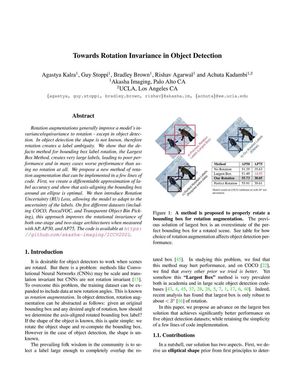 Rotation augmentations generally improve a model's invariance/equivariance to rotation - except in object detection. In object detection the shape is not known, therefore rotation creates a label ambiguity. We show that the de-facto method for bounding box label rotation, the Largest Box Method, creates very large labels, leading to poor performance and in many cases worse performance than using no rotation at all. We propose a new method of rotation augmentation that can be implemented in a few lines of code. First, we create a differentiable approximation of label accuracy and show that axis-aligning the bounding box around an ellipse is optimal. We then introduce Rotation Uncertainty (RU) Loss, allowing the model to adapt to the uncertainty of the labels. On five different datasets (including COCO, PascalVOC, and Transparent Object Bin Picking), this approach improves the rotational invariance of both one-stage and two-stage architectures when measured with AP, AP50, and AP75. The code is available at https://github.com/akasha-imaging/ICCV2021.