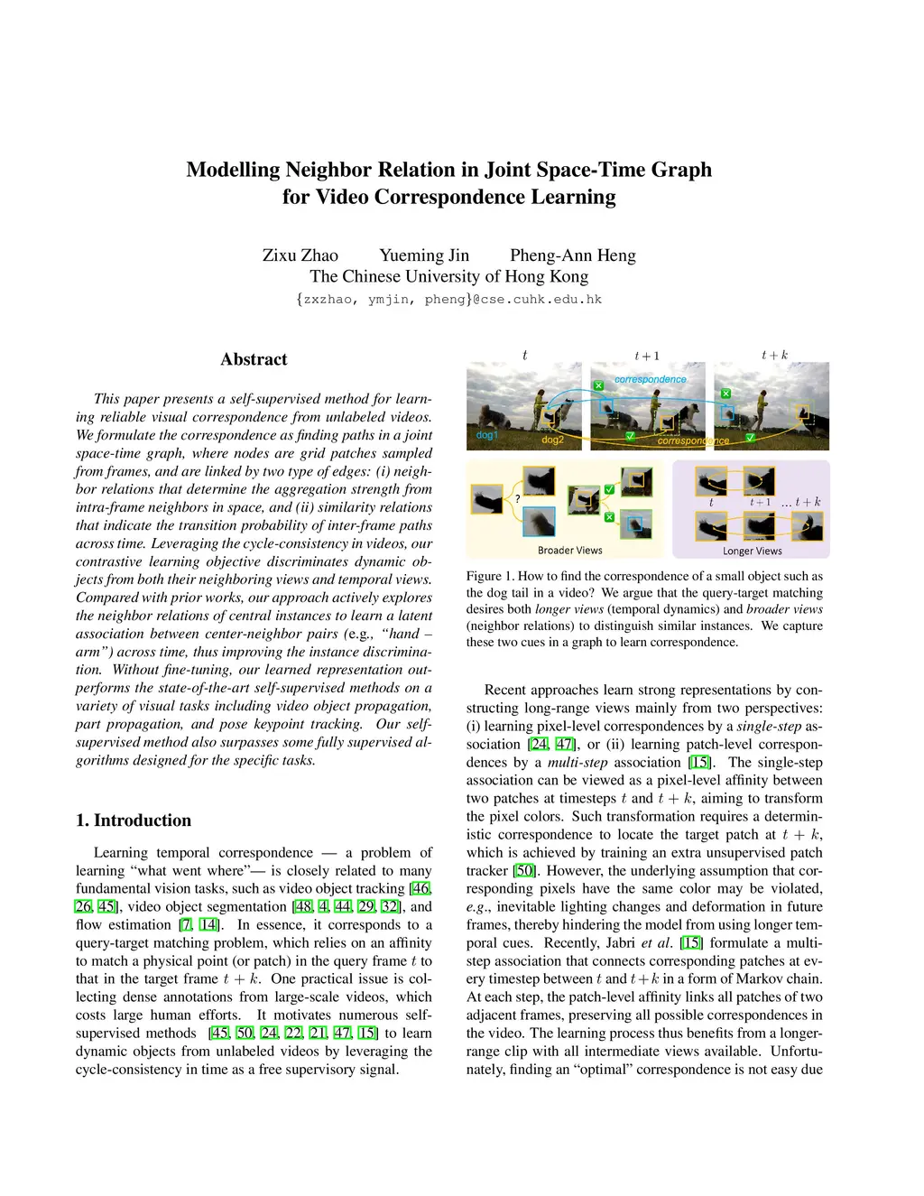 This paper presents a self-supervised method for learning reliable visual correspondence from unlabeled videos. We formulate the correspondence as finding paths in a joint space-time graph, where nodes are grid patches sampled from frames, and are linked by two types of edges: (i) neighbor relations that determine the aggregation strength from intra-frame neighbors in space, and (ii) similarity relations that indicate the transition probability of inter-frame paths across time. Leveraging the cycle-consistency in videos, our contrastive learning objective discriminates dynamic objects from both their neighboring views and temporal views. Compared with prior works, our approach actively explores the neighbor relations of central instances to learn a latent association between center-neighbor pairs (e.g., "hand -- arm") across time, thus improving the instance discrimination. Without fine-tuning, our learned representation outperforms the state-of-the-art self-supervised methods on a variety of visual tasks including video object propagation, part propagation, and pose keypoint tracking. Our self-supervised method also surpasses some fully supervised algorithms designed for the specific tasks.