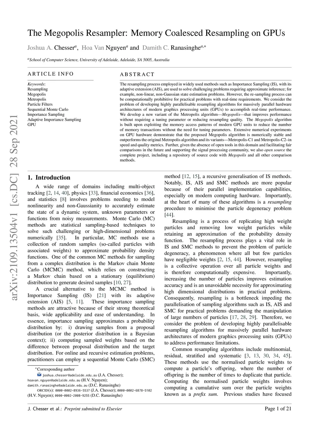 The resampling process employed in widely used methods such as Importance Sampling (IS), with its adaptive extension (AIS), are used to solve challenging problems requiring approximate inference; for example, non-linear, non-Gaussian state estimation problems. However, the re-sampling process can be computationally prohibitive for practical problems with real-time requirements. We consider the problem of developing highly parallelisable resampling algorithms for massively parallel hardware architectures of modern graphics processing units (GPUs) to accomplish real-time performance. We develop a new variant of the Metropolis algorithm -- Megopolis -- that improves performance without requiring a tuning parameter or reducing resampling quality. The Megopolis algorithm is built upon exploiting the memory access patterns of modern GPU units to reduce the number of memory transactions without the need for tuning parameters. Extensive numerical experiments on GPU hardware demonstrate that the proposed Megopolis algorithm is numerically stable and outperforms the original Metropolis algorithm and its variants -- Metropolis-C1 and Metropolis-C2 -- in speed and quality metrics. Further, given the absence of open tools in this domain and facilitating fair comparisons in the future and supporting the signal processing community, we also open source the complete project, including a repository of source code with Megopolis and all other comparison methods.