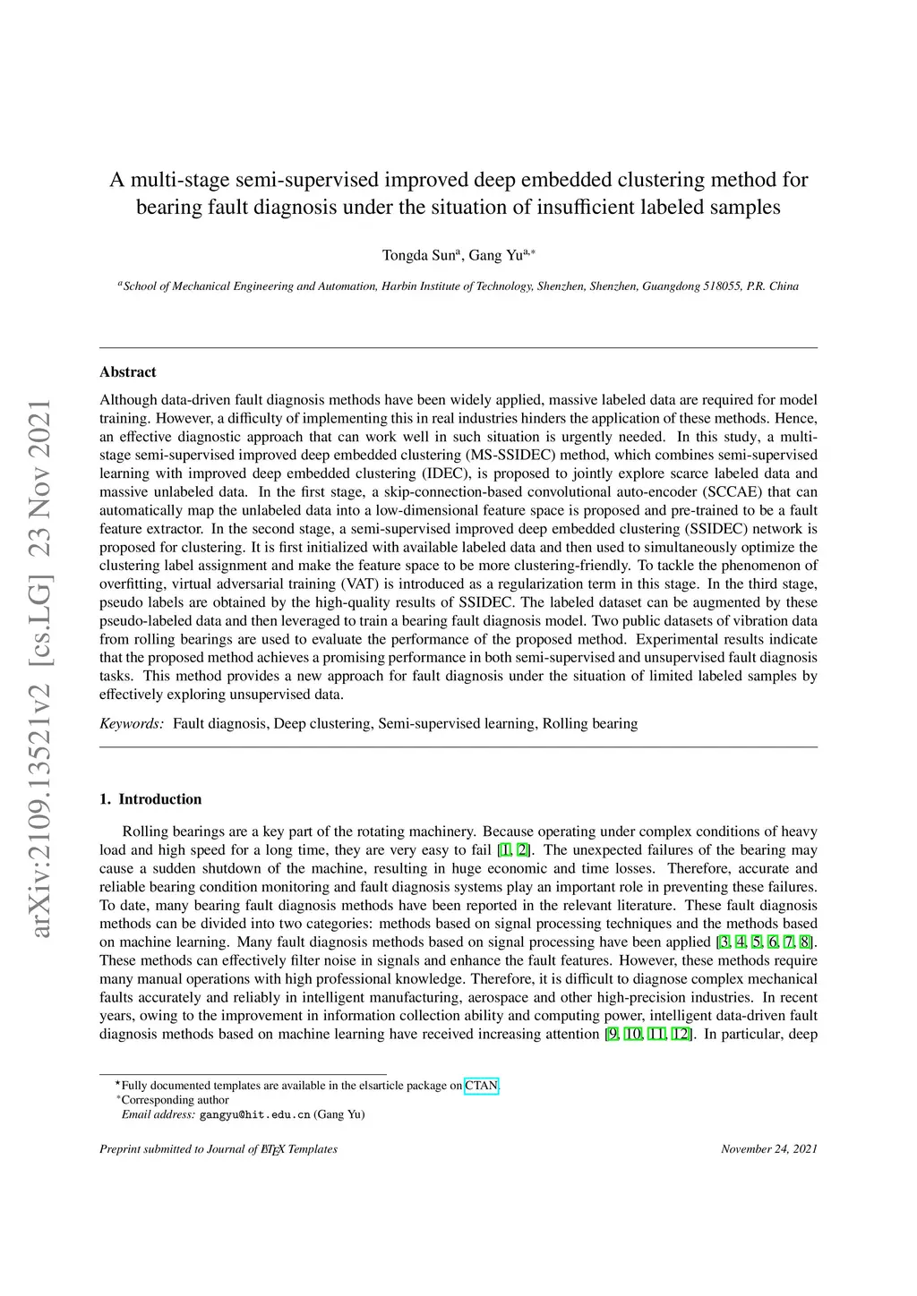Although data-driven fault diagnosis methods have been widely applied, massive labeled data are required for model training. However, a difficulty of implementing this in real industries hinders the application of these methods. Hence, an effective diagnostic approach that can work well in such situation is urgently needed.In this study, a multi-stage semi-supervised improved deep embedded clustering (MS-SSIDEC) method, which combines semi-supervised learning with improved deep embedded clustering (IDEC), is proposed to jointly explore scarce labeled data and massive unlabeled data. In the first stage, a skip-connection-based convolutional auto-encoder (SCCAE) that can automatically map the unlabeled data into a low-dimensional feature space is proposed and pre-trained to be a fault feature extractor. In the second stage, a semi-supervised improved deep embedded clustering (SSIDEC) network is proposed for clustering. It is first initialized with available labeled data and then used to simultaneously optimize the clustering label assignment and make the feature space to be more clustering-friendly. To tackle the phenomenon of overfitting, virtual adversarial training (VAT) is introduced as a regularization term in this stage. In the third stage, pseudo labels are obtained by the high-quality results of SSIDEC. The labeled dataset can be augmented by these pseudo-labeled data and then leveraged to train a bearing fault diagnosis model. Two public datasets of vibration data from rolling bearings are used to evaluate the performance of the proposed method. Experimental results indicate that the proposed method achieves a promising performance in both semi-supervised and unsupervised fault diagnosis tasks. This method provides a new approach for fault diagnosis under the situation of limited labeled samples by effectively exploring unsupervised data.