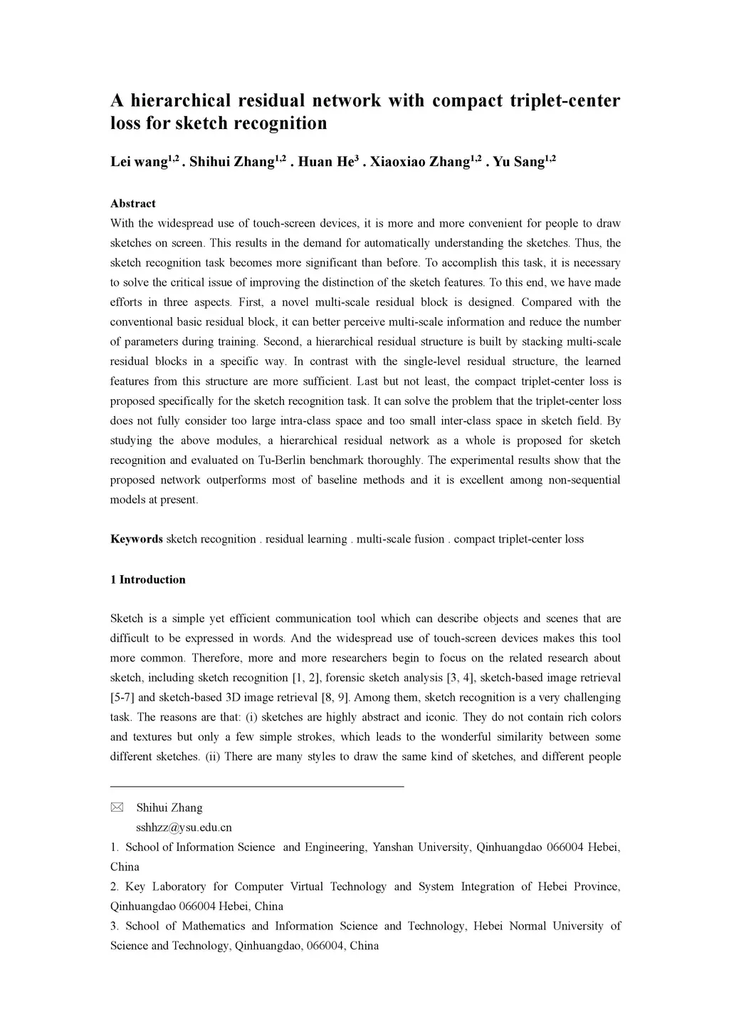 With the widespread use of touch-screen devices, it is more and more convenient for people to draw sketches on screen. This results in the demand for automatically understanding the sketches. Thus, the sketch recognition task becomes more significant than before. To accomplish this task, it is necessary to solve the critical issue of improving the distinction of the sketch features. To this end, we have made efforts in three aspects. First, a novel multi-scale residual block is designed. Compared with the conventional basic residual block, it can better perceive multi-scale information and reduce the number of parameters during training. Second, a hierarchical residual structure is built by stacking multi-scale residual blocks in a specific way. In contrast with the single-level residual structure, the learned features from this structure are more sufficient. Last but not least, the compact triplet-center loss is proposed specifically for the sketch recognition task. It can solve the problem that the triplet-center loss does not fully consider too large intra-class space and too small inter-class space in sketch field. By studying the above modules, a hierarchical residual network as a whole is proposed for sketch recognition and evaluated on Tu-Berlin benchmark thoroughly. The experimental results show that the proposed network outperforms most of baseline methods and it is excellent among non-sequential models at present.