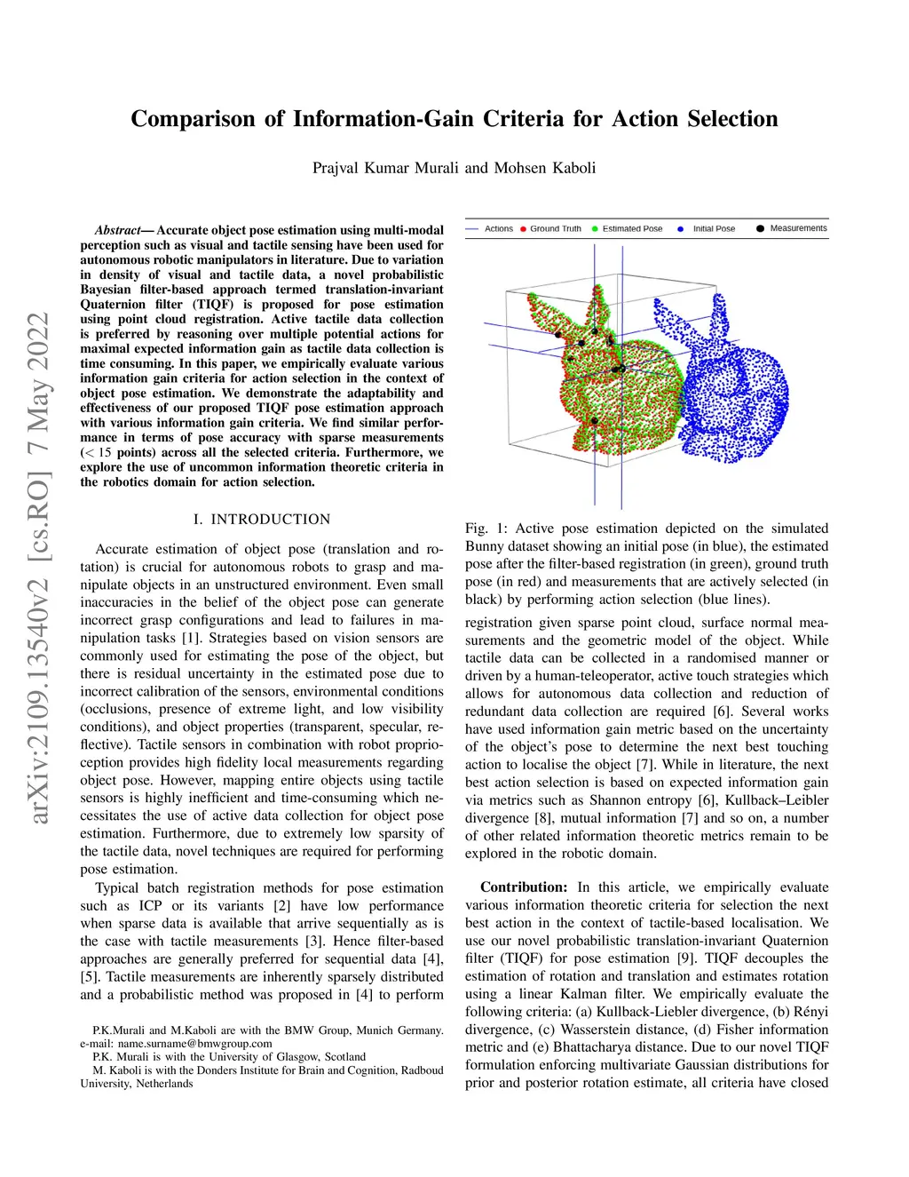 Accurate object pose estimation using multi-modal perception such as visual and tactile sensing have been used for autonomous robotic manipulators in literature. Due to variation in density of visual and tactile data, a novel probabilistic Bayesian filter-based approach termed translation-invariant Quaternion filter (TIQF) is proposed for pose estimation using point cloud registration. Active tactile data collection is preferred by reasoning over multiple potential actions for maximal expected information gain as tactile data collection is time consuming. In this paper, we empirically evaluate various information gain criteria for action selection in the context of object pose estimation. We demonstrate the adaptability and effectiveness of our proposed TIQF pose estimation approach with various information gain criteria. We find similar performance in terms of pose accuracy with sparse measurements (<15 points) across all the selected criteria. Furthermore, we explore the use of uncommon information theoretic criteria in the robotics domain for action selection.